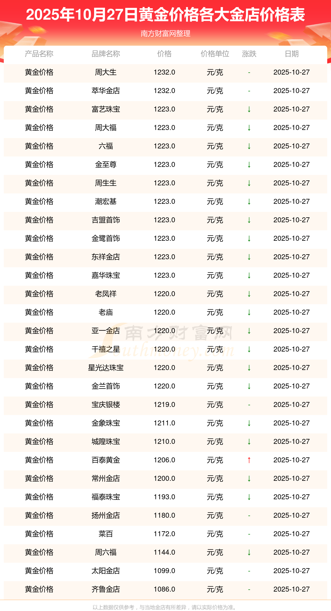 2025年10月27日谢瑞麟、谢瑞麟、金银街、金银街、金银街、金银街、金银街、金银街、多边金都珠宝、多边金都珠宝、多边金都珠宝等各大金店品牌黄金价格最新价格如下:谢瑞麟铂金饰品(香港)13630.0,谢瑞麟金条金价(香港)40840.0,金银街投资金条1198.0元/克,金银街工艺金条1213.0元/克,金银街千足金首饰1203.0元/克,金银街投资银条10.9元/克,金银街黄金回购923.0元/克,金银街白银回购10.2元/克,多边金都珠宝千足金饰品1129.0元/克,多边金都珠宝3D硬金1169.0元/克,多边金都珠宝精品挂件1089.0元/克。