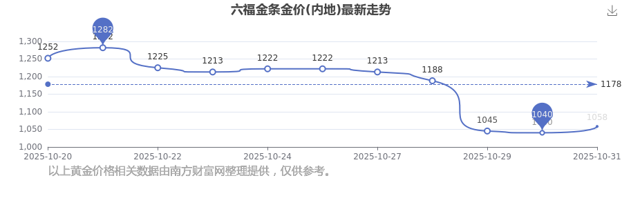 2025年11月1日六福金条金价(内地):1058.0元/克。