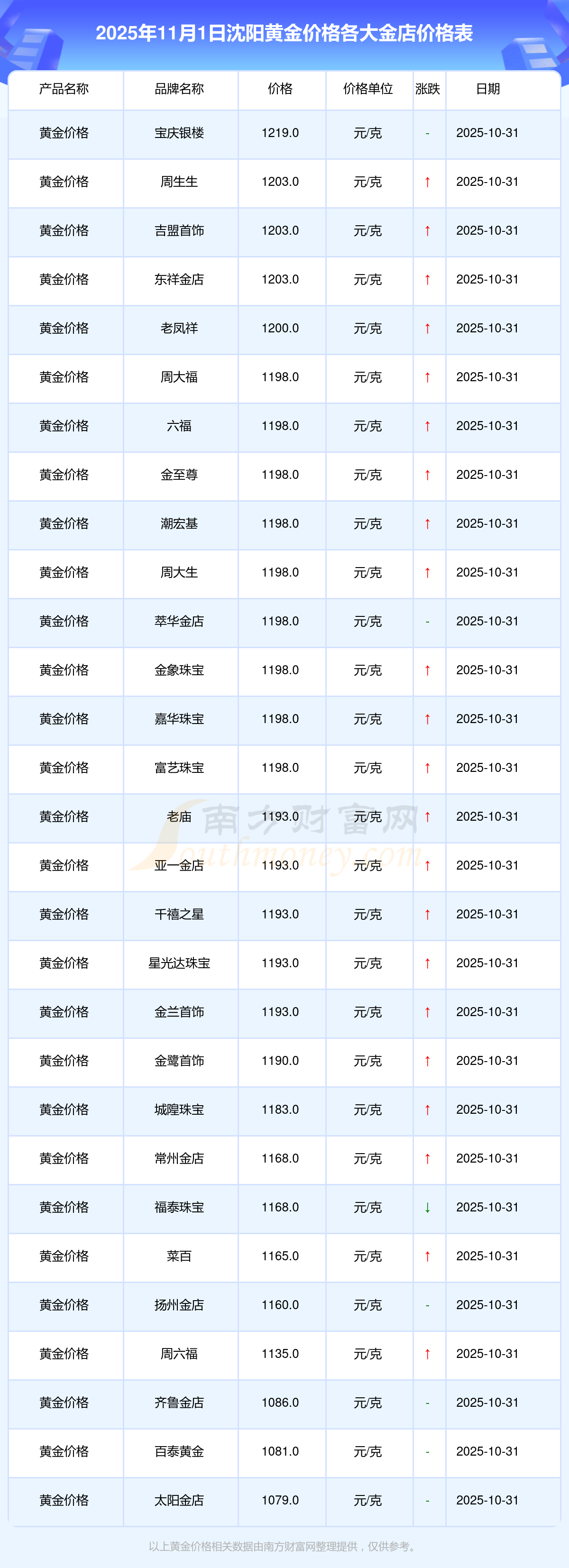 一、沈阳各金店黄金价格表最新是多少钱,今日黄金的克重价格是多少,今日黄金多少一克最新价格表