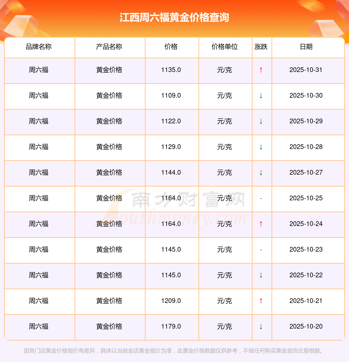 2025年11月1日,周大福、周大福、周大福、周大福、周大福、周大福、周大福、老凤祥、老凤祥、老凤祥、周六福等各大金店品牌黄金价格今日价格如下:周大福1198.0元/克、周大福650.0元/克、周大福1198.0元/克、周大福44660.0、周大福18640.0、周大福40080.0、周大福1058.0元/克、老凤祥1200.0元/克、老凤祥560.0元/克、老凤祥1200.0元/克、周六福1135.0元/克。