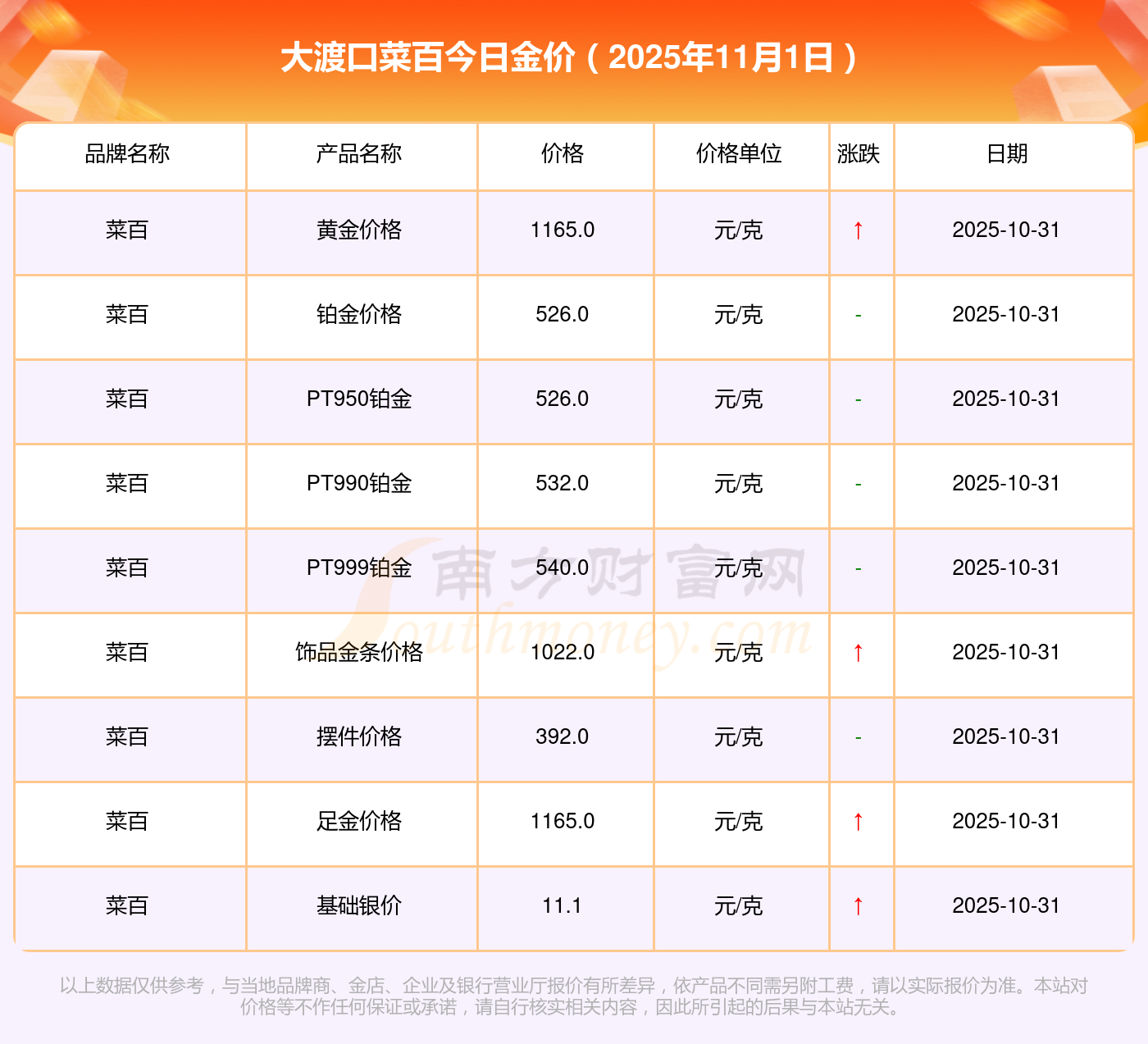 2025年11月1日大渡口菜百金价查询:黄金价格1198.0元/克,铂金价格650.0元/克,饰品金价(内地)1198.0元/克,黄金饰品(香港)44660.0,铂金价格(香港)18640.0,金条价格(香港)40080.0,金条金价(内地)1058.0元/克,黄金价格1200.0元/克,铂金价格560.0元/克,足金价格1200.0元/克,黄金价格1135.0元/克。
