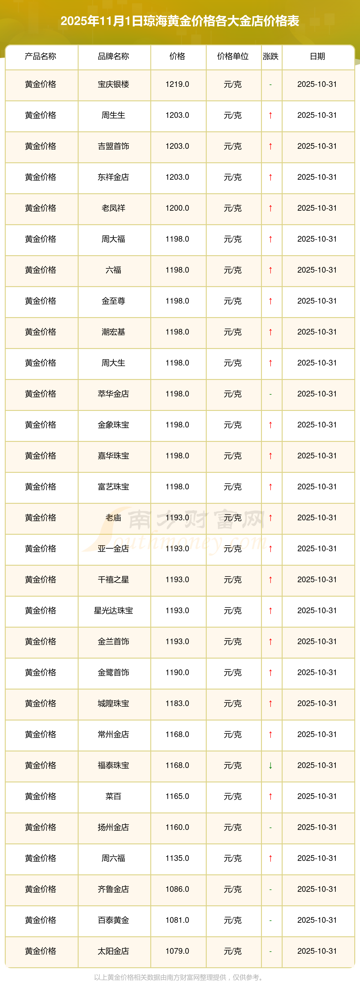 2025年11月1日琼海各大金店黄金价格最新价格查询来了:周大福1198.0元/克,周大福650.0元/克,周大福1198.0元/克,周大福44660.0,周大福18640.0,周大福40080.0,周大福1058.0元/克,老凤祥1200.0元/克,老凤祥560.0元/克,老凤祥1200.0元/克,周六福1135.0元/克。