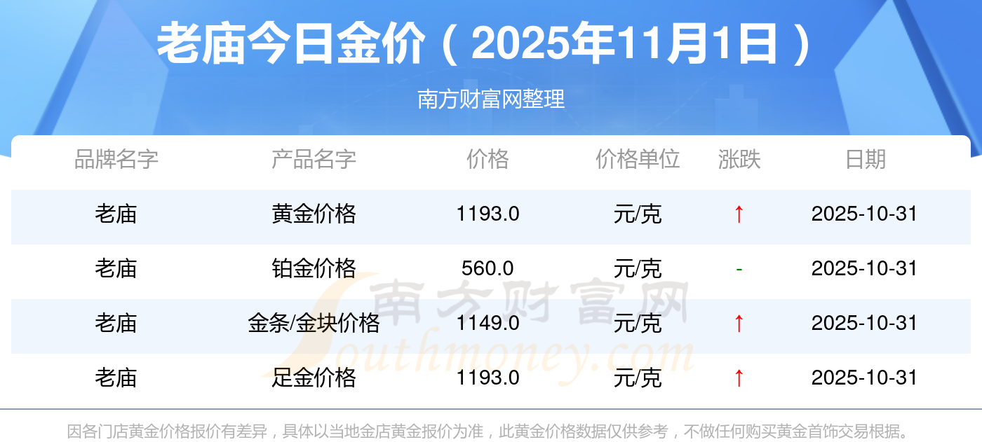 2025年11月1日老庙最新价格:黄金价格1198.0元/克,铂金价格650.0元/克,饰品金价(内地)1198.0元/克,黄金饰品(香港)44660.0,铂金价格(香港)18640.0,金条价格(香港)40080.0,金条金价(内地)1058.0元/克,黄金价格1200.0元/克,铂金价格560.0元/克,足金价格1200.0元/克,黄金价格1135.0元/克。
