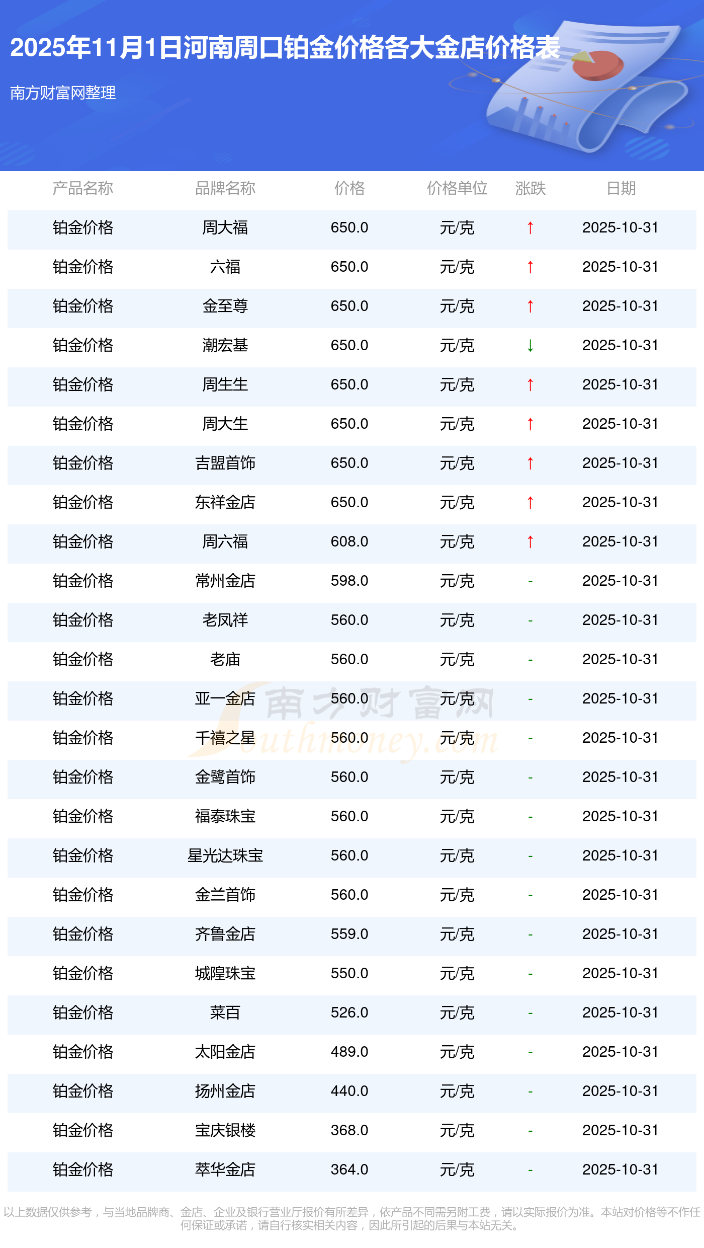 2025年11月1日河南周口各大金店铂金价格最新价格查询来了:周大福1198.0元/克,周大福650.0元/克,周大福1198.0元/克,周大福44660.0,周大福18640.0,周大福40080.0,周大福1058.0元/克,老凤祥1200.0元/克,老凤祥560.0元/克,老凤祥1200.0元/克,周六福1135.0元/克。