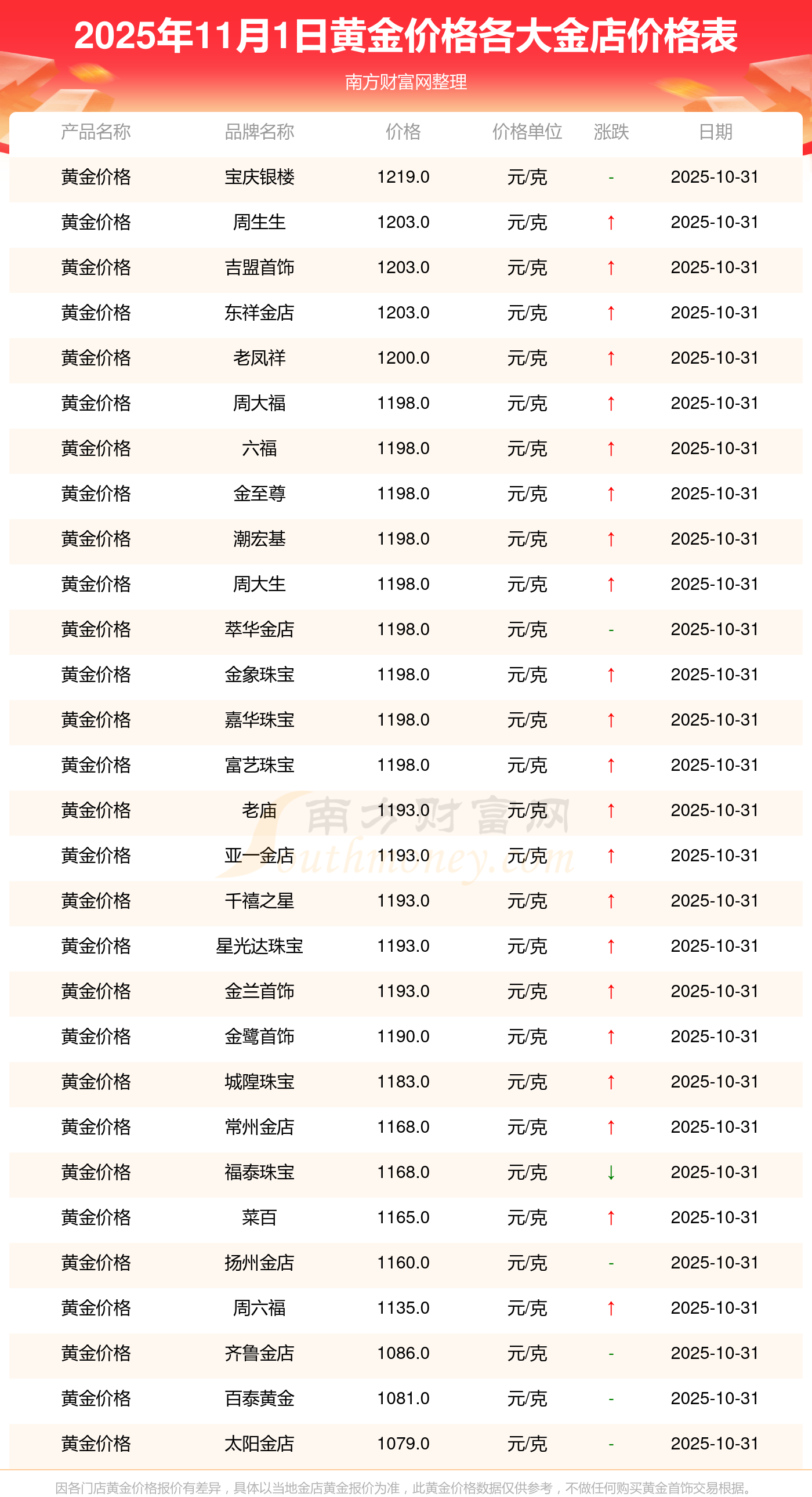 2025年11月1日,周大福、周大福、周大福、周大福、周大福、周大福、周大福、老凤祥、老凤祥、老凤祥、周六福等各大金店品牌黄金价格今日价格如下:周大福1198.0元/克、周大福650.0元/克、周大福1198.0元/克、周大福44660.0、周大福18640.0、周大福40080.0、周大福1058.0元/克、老凤祥1200.0元/克、老凤祥560.0元/克、老凤祥1200.0元/克、周六福1135.0元/克。