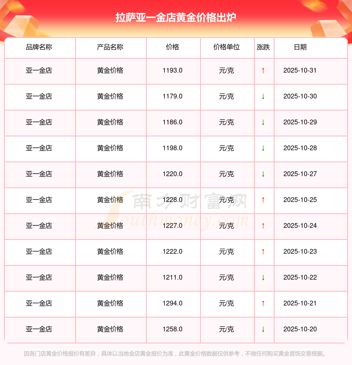 今日拉萨亚一金店黄金价格查询,2025年11月1日,今日拉萨亚一金店黄金价格:1193.0元/克。