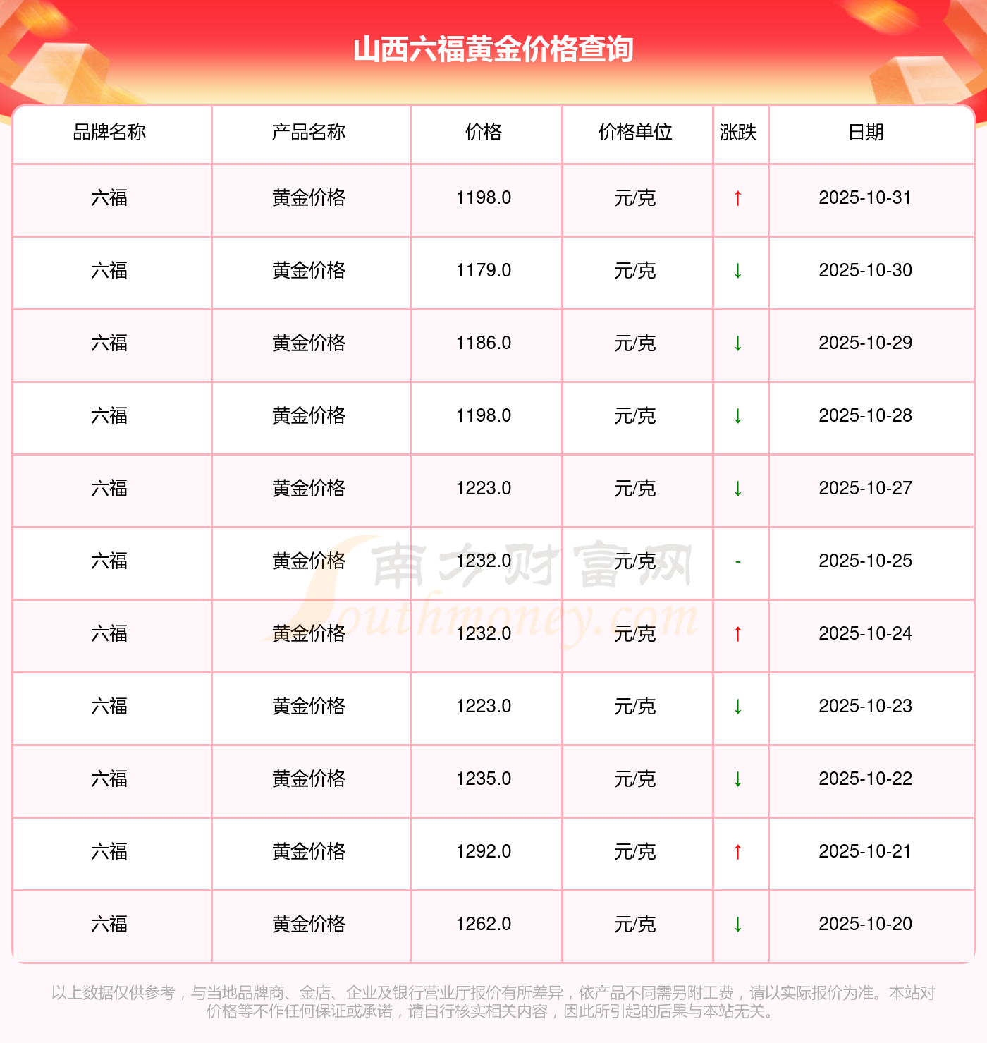 一、山西六福黄金价格表来了