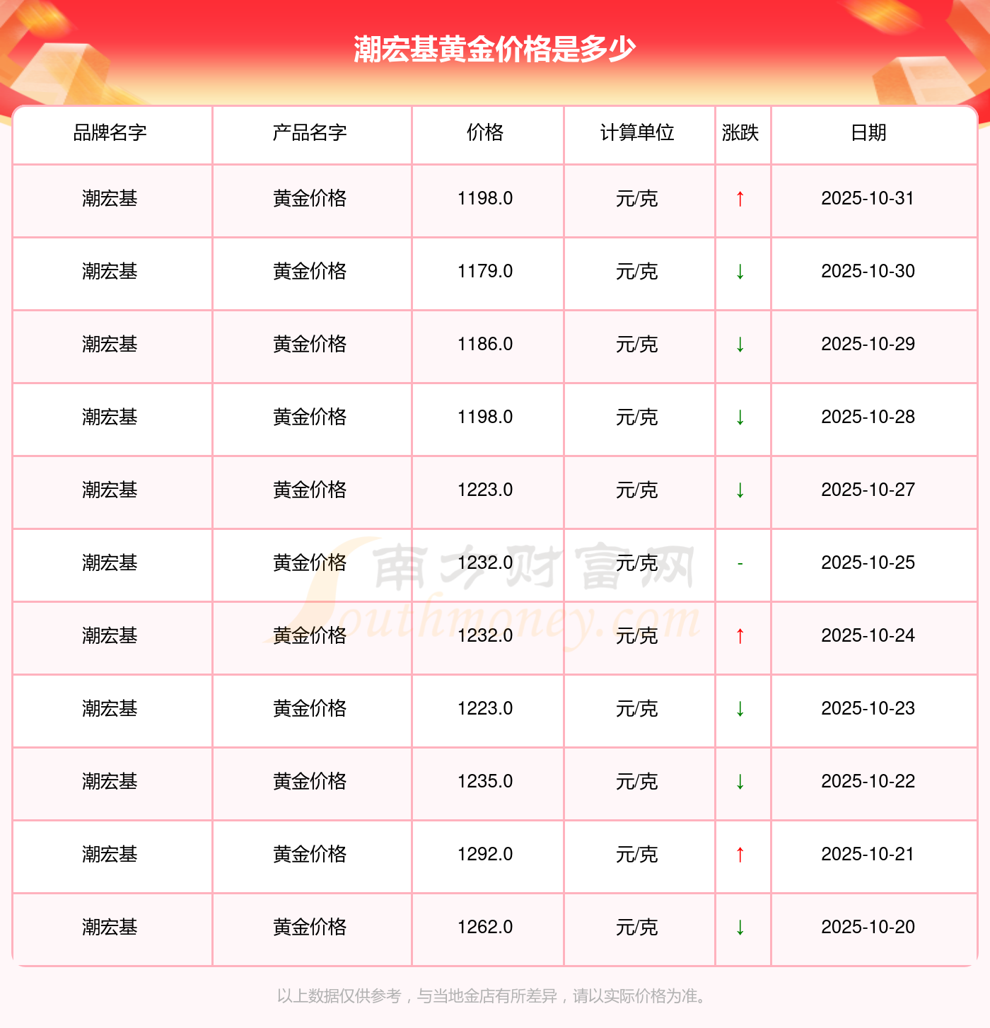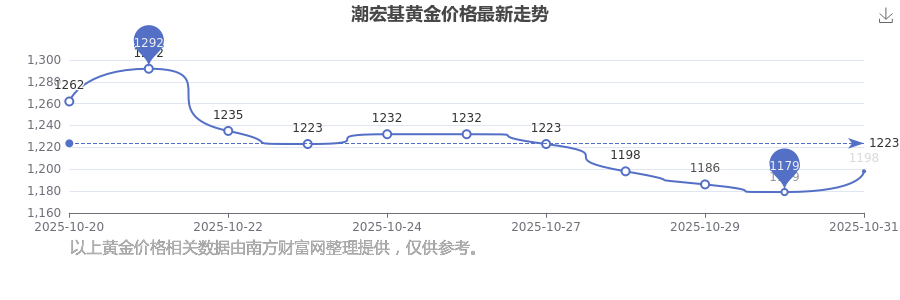 今日黄金价格情况如何?此刻黄金一克要多少钱?平常来说一克黄金的价格大概是多少?今日(2025年11月1日)潮宏基黄金价格为1198.0元/克。