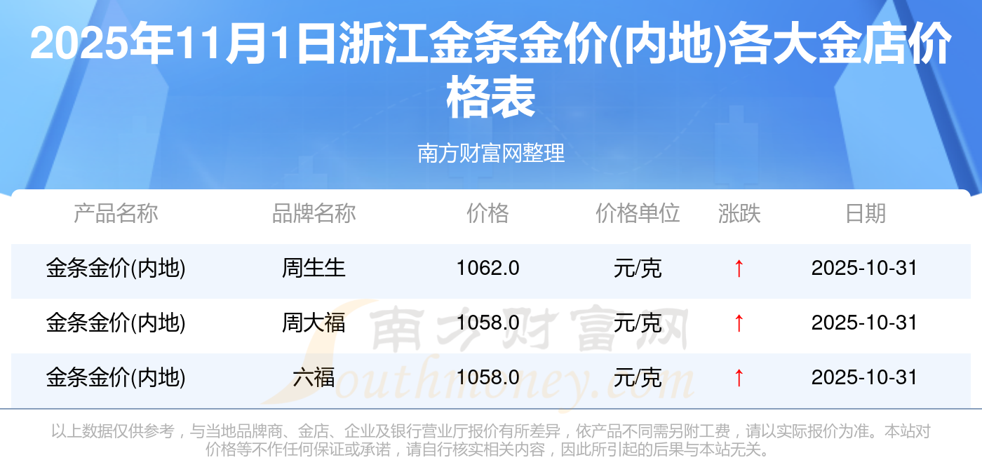 2025年11月1日,浙江周大福、周大福、周大福、周大福、周大福、周大福、周大福、老凤祥、老凤祥、老凤祥、周六福等各大金店品牌金条金价(内地)今日价格如下:周大福1198.0元/克、周大福650.0元/克、周大福1198.0元/克、周大福44660.0、周大福18640.0、周大福40080.0、周大福1058.0元/克、老凤祥1200.0元/克、老凤祥560.0元/克、老凤祥1200.0元/克、周六福1135.0元/克。