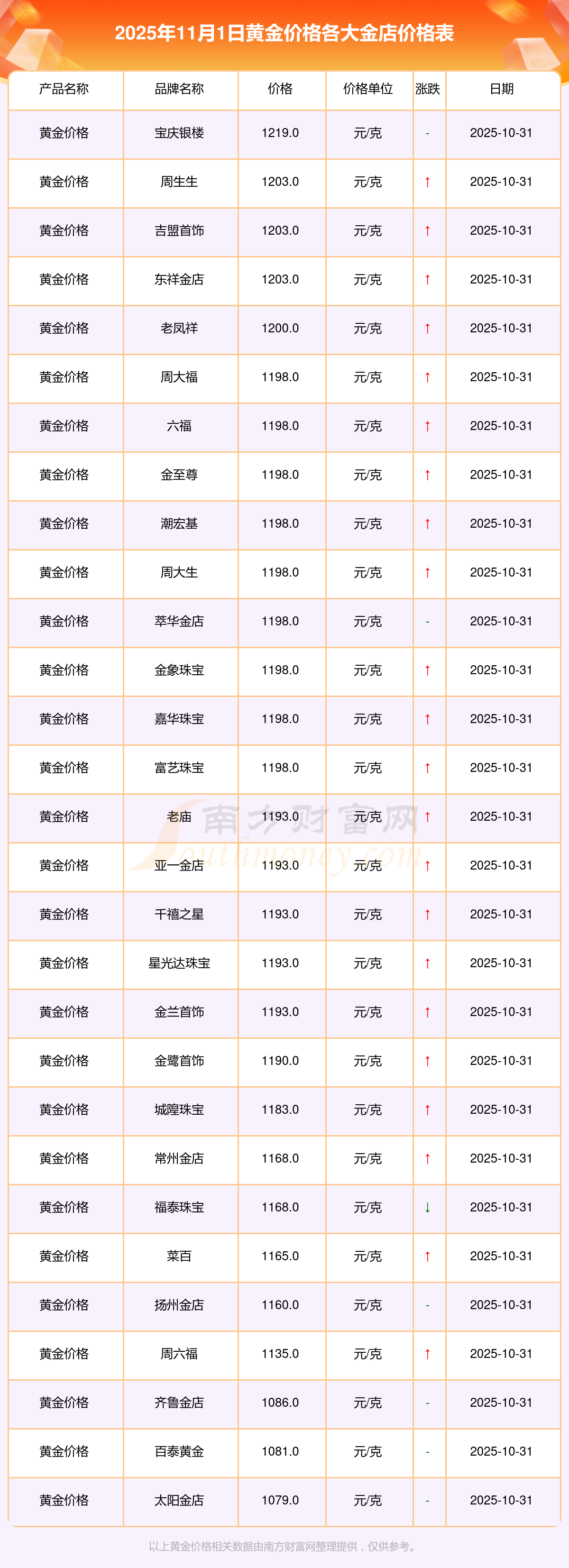 2025年11月1日各大金店黄金价格是多少钱1g?现在各大金店黄金价格是多少,一起来看看吧!