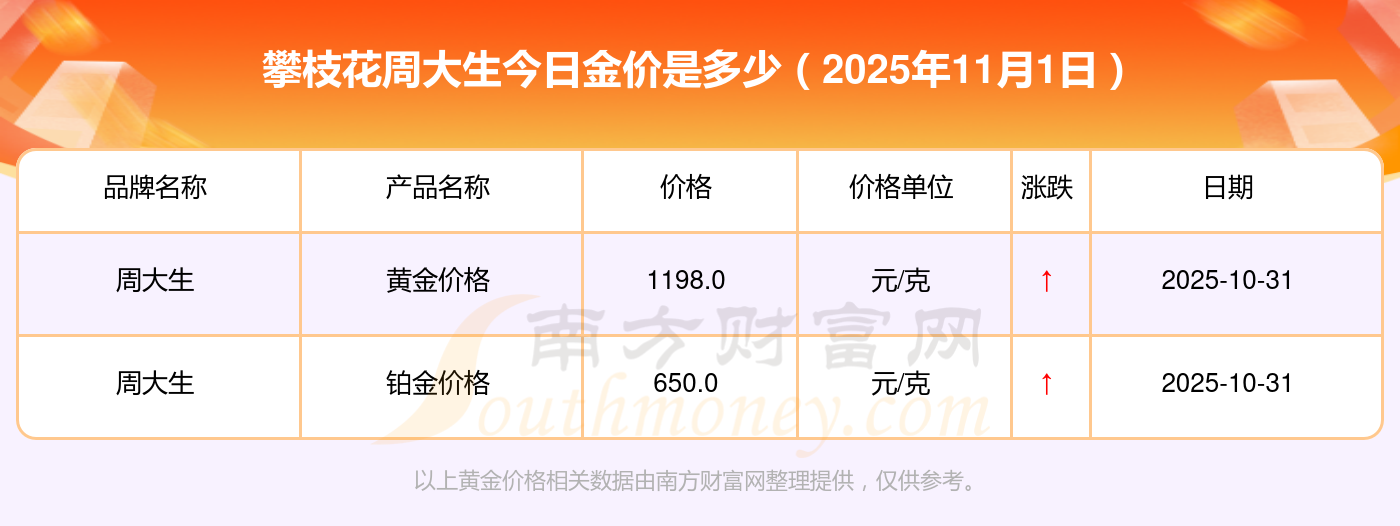 今日黄金价格查询_现在金价黄金一克多少钱,黄金价格是多少钱一克?2025年11月1日攀枝花周大生现在购买一克黄金需要支付多少钱?黄金价格1198.0元/克,铂金价格650.0元/克,饰品金价(内地)1198.0元/克,黄金饰品(香港)44660.0,铂金价格(香港)18640.0,金条价格(香港)40080.0,金条金价(内地)1058.0元/克,黄金价格1200.0元/克,铂金价格560.0元/克,足金价格1200.0元/克,黄金价格1135.0元/克。