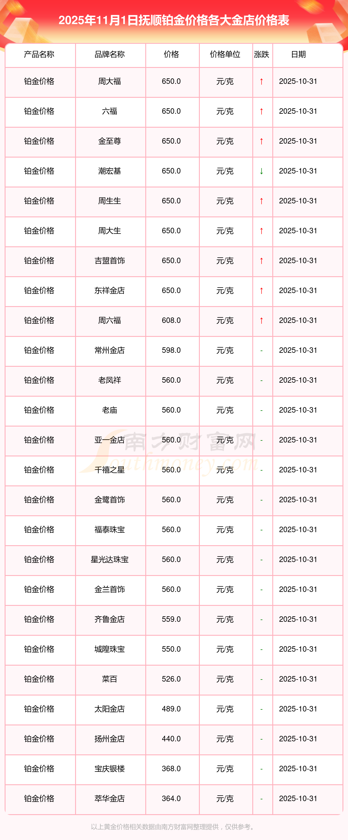 今天是2025年11月1日,抚顺周大福、周大福、周大福、周大福、周大福、周大福、周大福、老凤祥、老凤祥、老凤祥、周六福等各大金店品牌铂金价格最新价格如下:周大福1198.0元/克、周大福650.0元/克、周大福1198.0元/克、周大福44660.0、周大福18640.0、周大福40080.0、周大福1058.0元/克、老凤祥1200.0元/克、老凤祥560.0元/克、老凤祥1200.0元/克、周六福1135.0元/克。