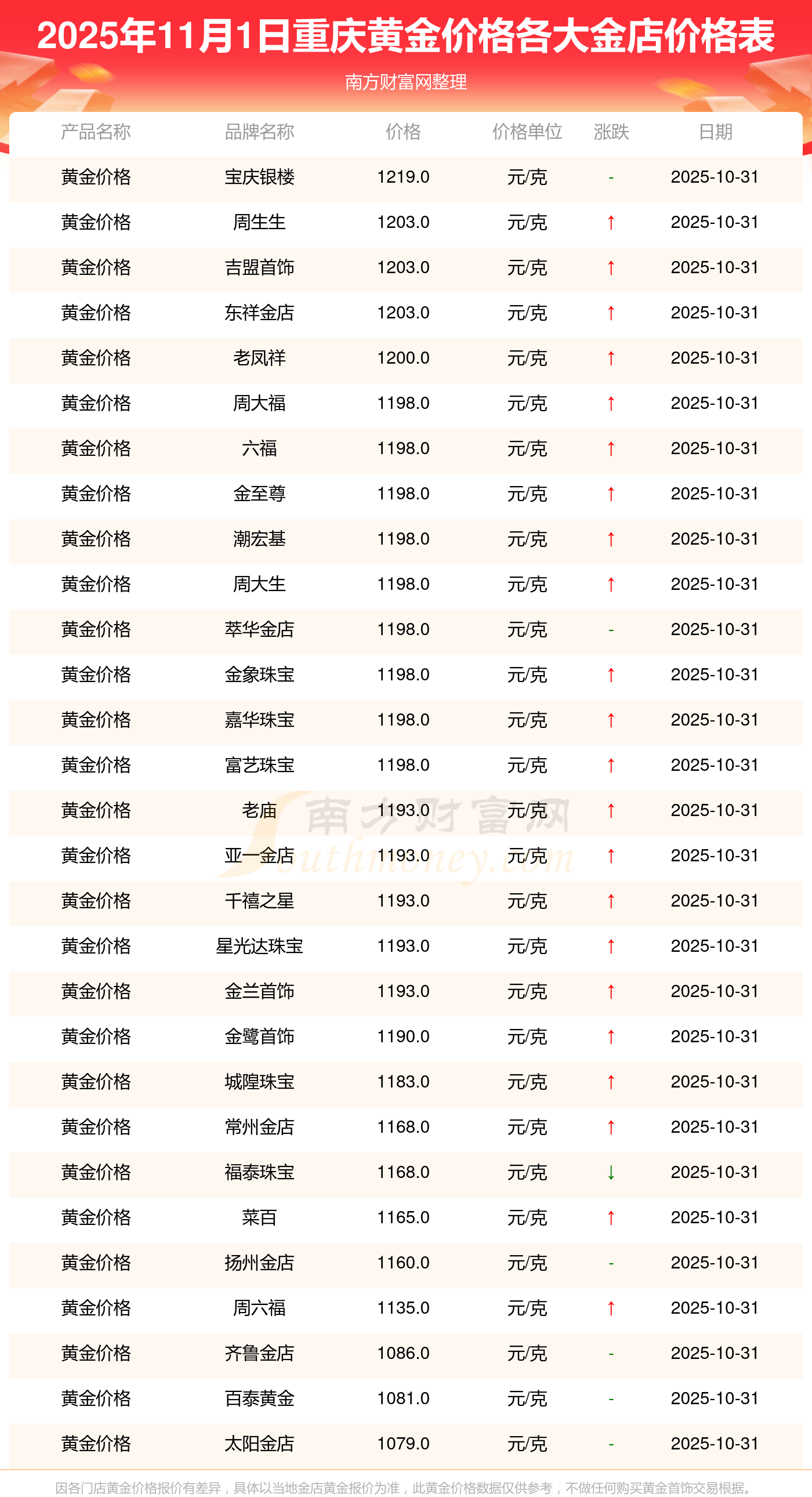 2025年11月1日,重庆周大福、周大福、周大福、周大福、周大福、周大福、周大福、老凤祥、老凤祥、老凤祥、周六福等各大金店品牌黄金价格今日价格行情最新来了:周大福1198.0元/克、周大福650.0元/克、周大福1198.0元/克、周大福44660.0、周大福18640.0、周大福40080.0、周大福1058.0元/克、老凤祥1200.0元/克、老凤祥560.0元/克、老凤祥1200.0元/克、周六福1135.0元/克。