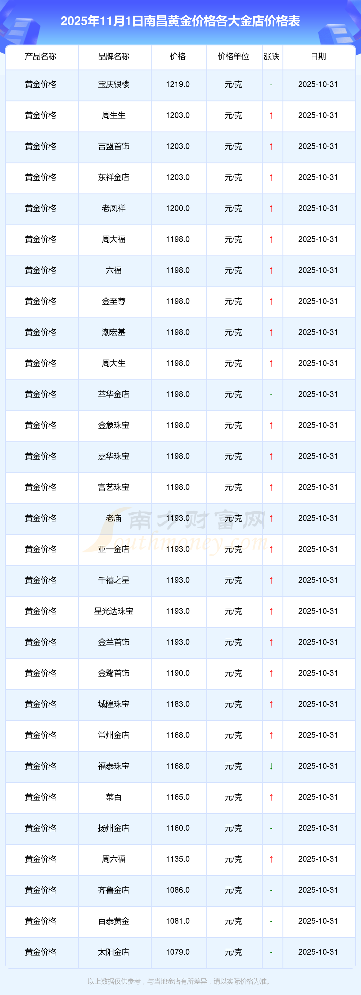 今天是2025年11月1日,南昌周大福、周大福、周大福、周大福、周大福、周大福、周大福、老凤祥、老凤祥、老凤祥、周六福等各大金店品牌黄金价格最新价格行情是这样的:周大福1198.0元/克、周大福650.0元/克、周大福1198.0元/克、周大福44660.0、周大福18640.0、周大福40080.0、周大福1058.0元/克、老凤祥1200.0元/克、老凤祥560.0元/克、老凤祥1200.0元/克、周六福1135.0元/克。