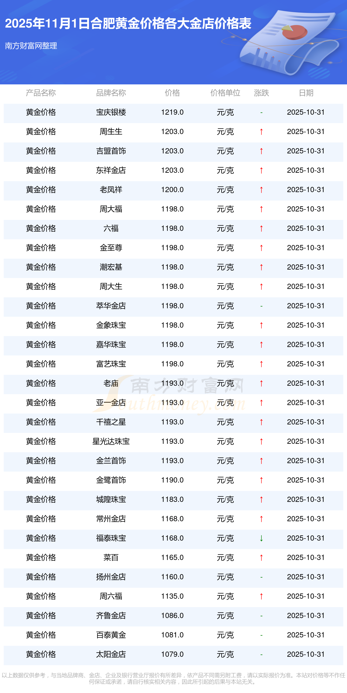 2025年11月1日合肥各大金店黄金价格最新价格:周大福1198.0元/克,周大福650.0元/克,周大福1198.0元/克,周大福44660.0,周大福18640.0,周大福40080.0,周大福1058.0元/克,老凤祥1200.0元/克,老凤祥560.0元/克,老凤祥1200.0元/克,周六福1135.0元/克。