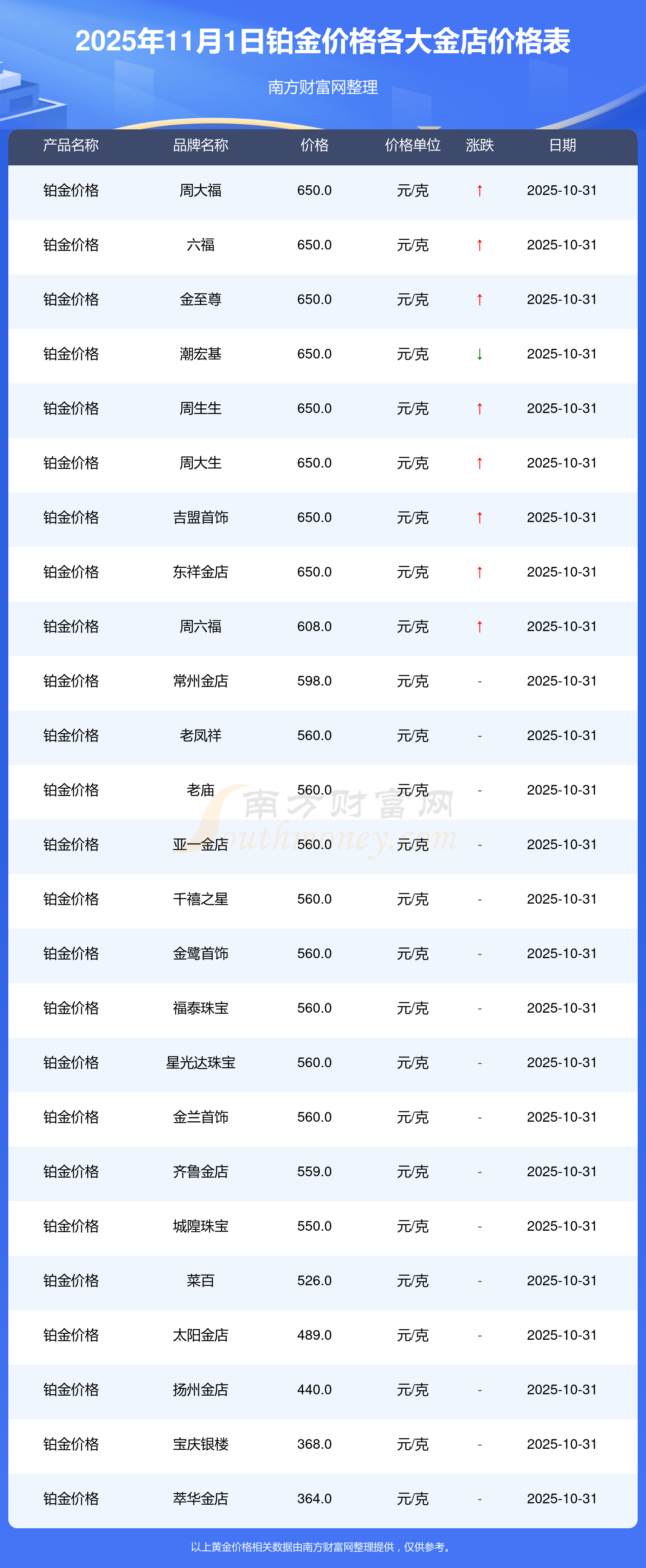 2025年11月1日周大福、周大福、周大福、周大福、周大福、周大福、周大福、老凤祥、老凤祥、老凤祥、周六福等各大金店品牌铂金价格最新价格如下:周大福黄金价格1198.0元/克,周大福铂金价格650.0元/克,周大福饰品金价(内地)1198.0元/克,周大福黄金饰品(香港)44660.0,周大福铂金价格(香港)18640.0,周大福金条价格(香港)40080.0,周大福金条金价(内地)1058.0元/克,老凤祥黄金价格1200.0元/克,老凤祥铂金价格560.0元/克,老凤祥足金价格1200.0元/克,周六福黄金价格1135.0元/克。