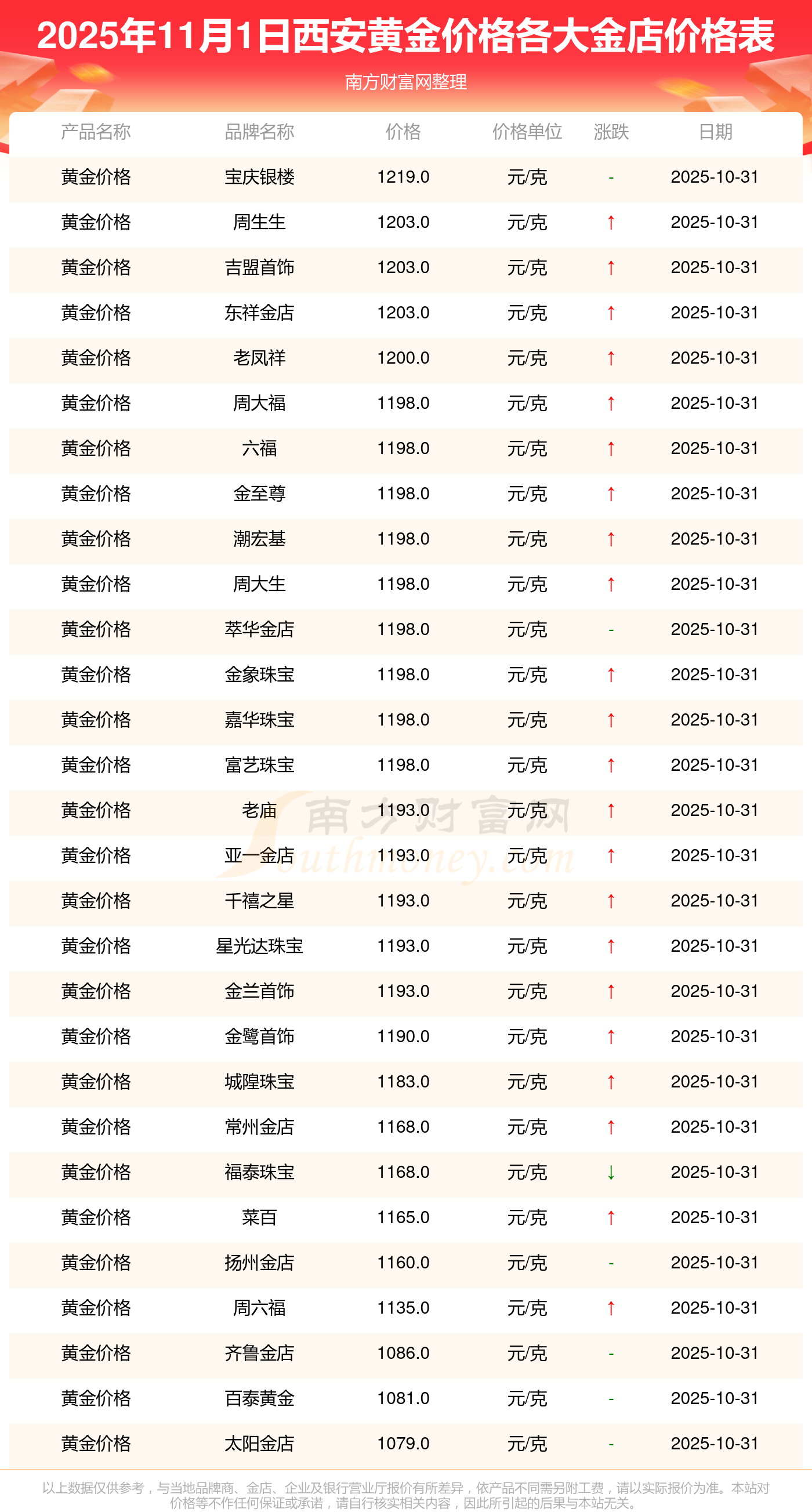 今天是2025年11月1日,西安周大福、周大福、周大福、周大福、周大福、周大福、周大福、老凤祥、老凤祥、老凤祥、周六福等各大金店品牌黄金价格最新价格如下:周大福1198.0元/克、周大福650.0元/克、周大福1198.0元/克、周大福44660.0、周大福18640.0、周大福40080.0、周大福1058.0元/克、老凤祥1200.0元/克、老凤祥560.0元/克、老凤祥1200.0元/克、周六福1135.0元/克。