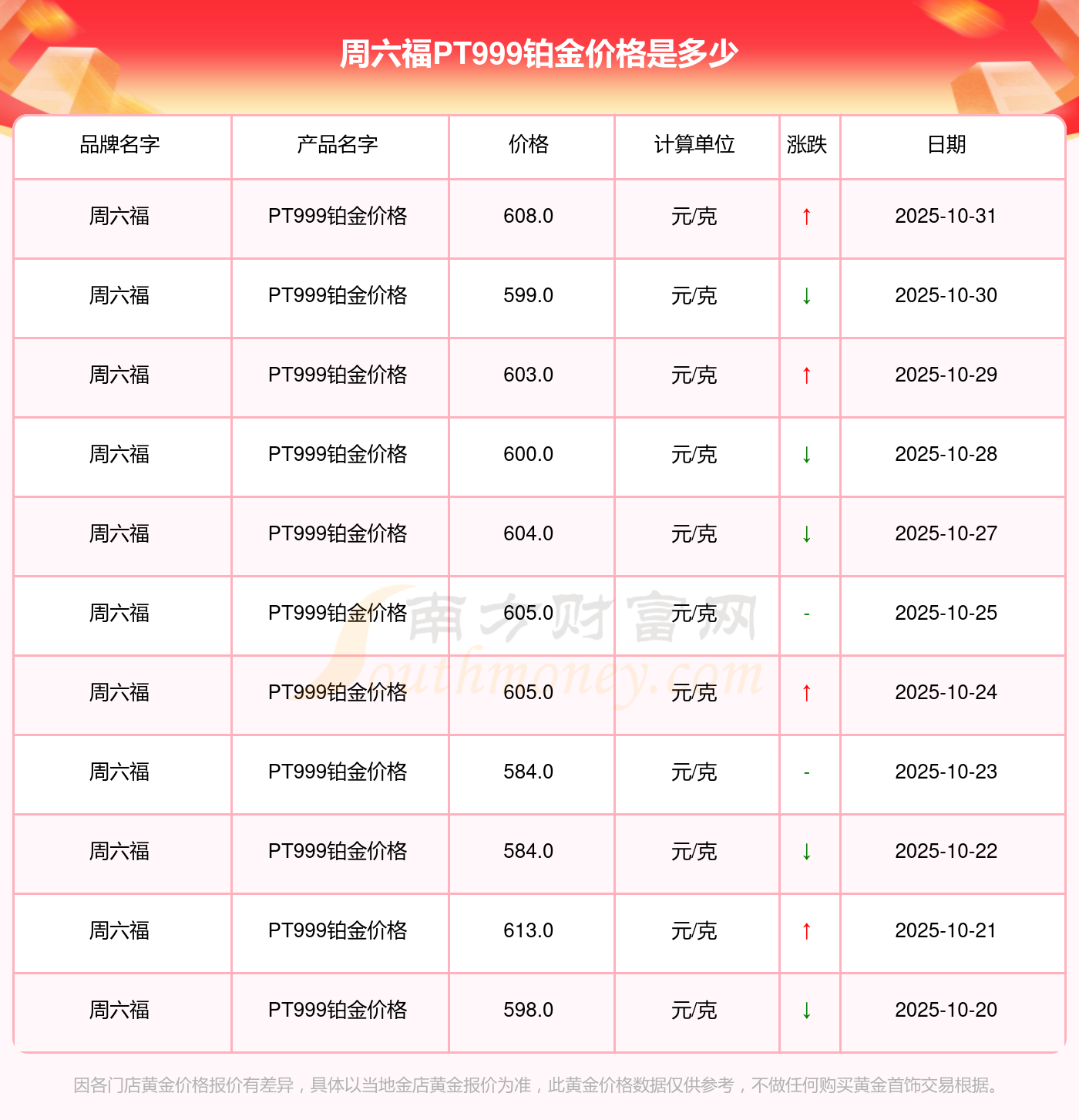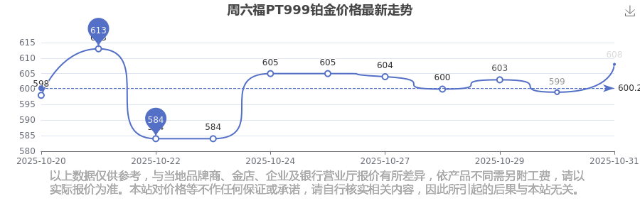 最新数据表明,周六福今日 PT999铂金价格为608.0元/克。