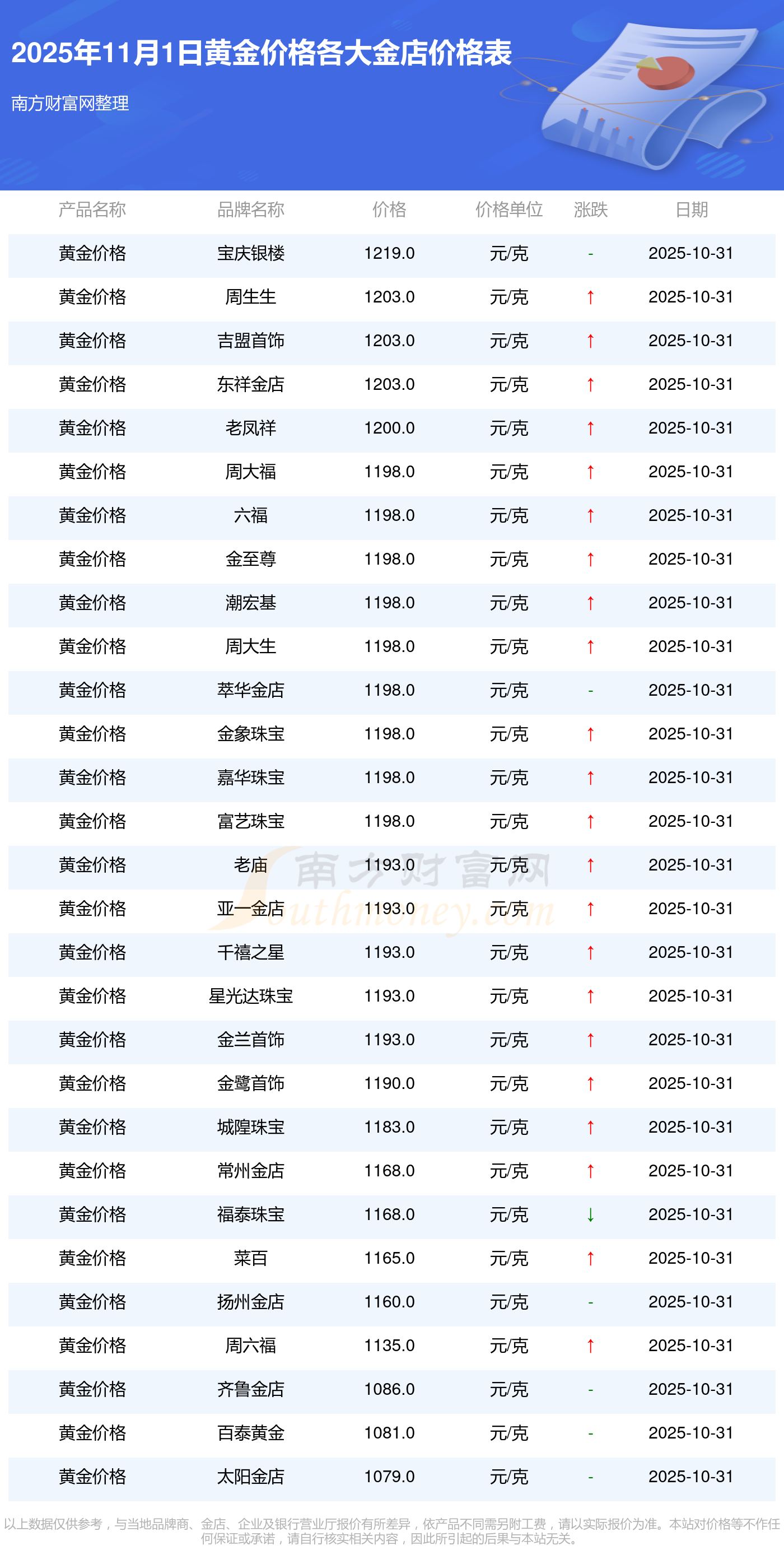 2025年11月1日各大金店黄金价格最新价格:周大福1198.0元/克,周大福650.0元/克,周大福1198.0元/克,周大福44660.0,周大福18640.0,周大福40080.0,周大福1058.0元/克,老凤祥1200.0元/克,老凤祥560.0元/克,老凤祥1200.0元/克,周六福1135.0元/克。
