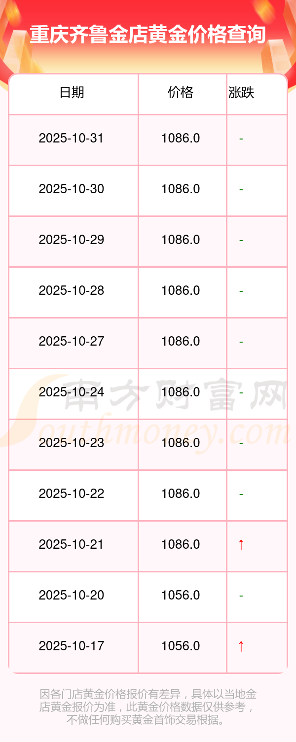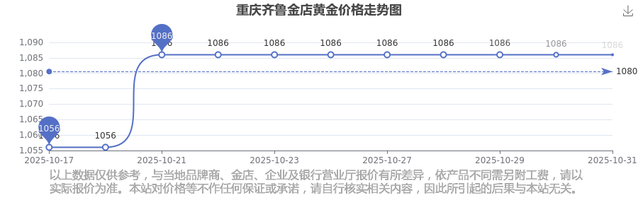今日(2025年11月1日)重庆齐鲁金店黄金价格是1086.0元/克。