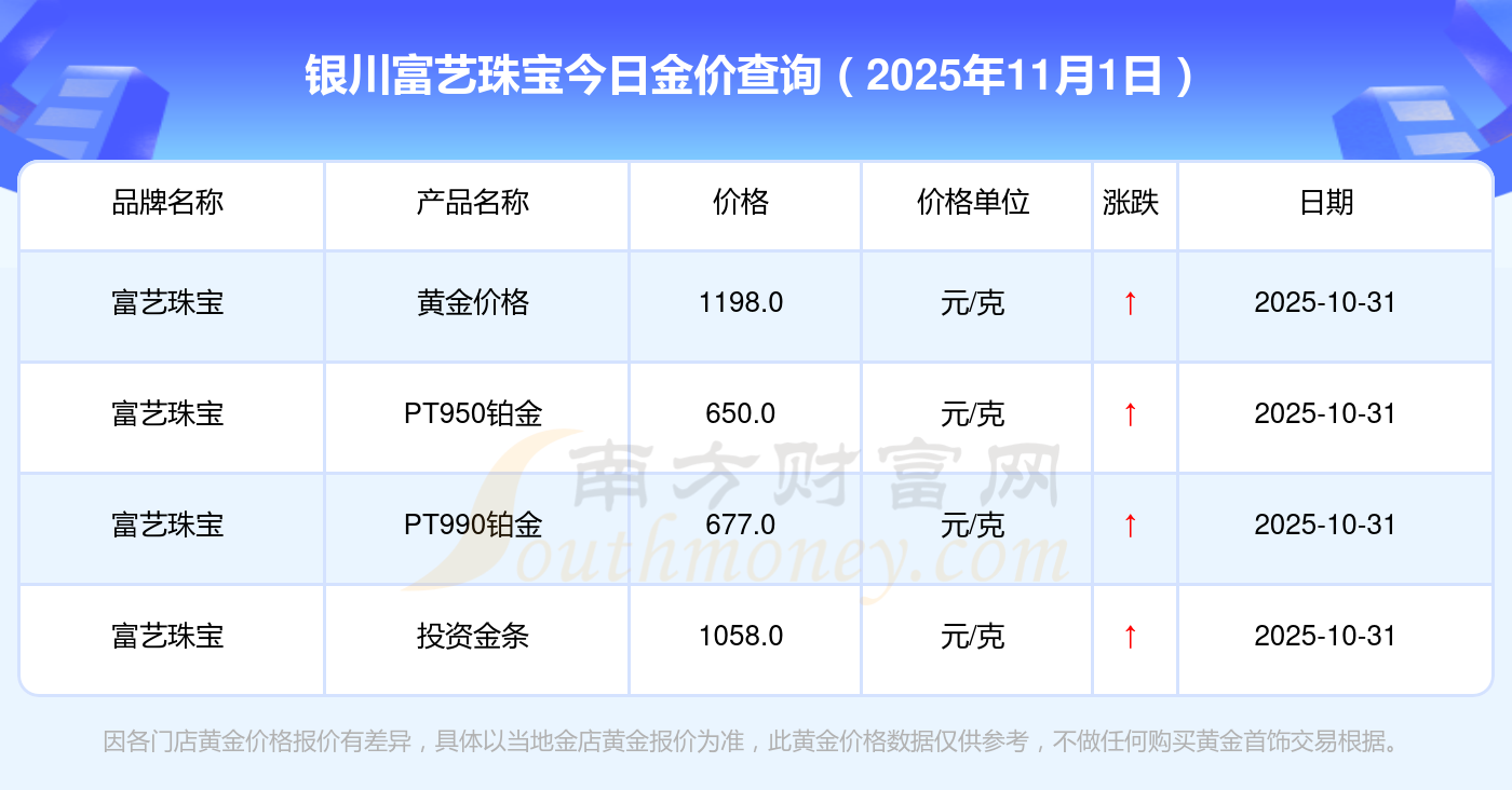 2025年11月1日银川富艺珠宝金价查询:黄金价格1198.0元/克,铂金价格650.0元/克,饰品金价(内地)1198.0元/克,黄金饰品(香港)44660.0,铂金价格(香港)18640.0,金条价格(香港)40080.0,金条金价(内地)1058.0元/克,黄金价格1200.0元/克,铂金价格560.0元/克,足金价格1200.0元/克,黄金价格1135.0元/克。