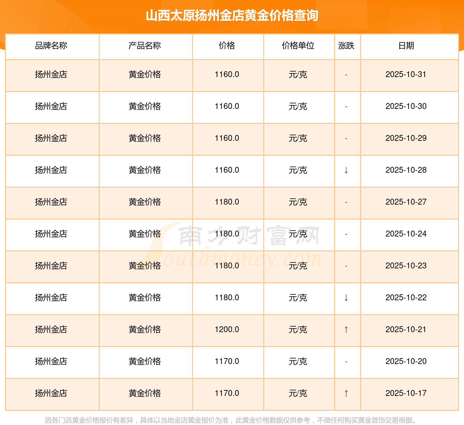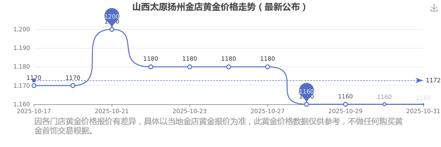 今日山西太原扬州金店黄金价格最新为:1160.0元/克。