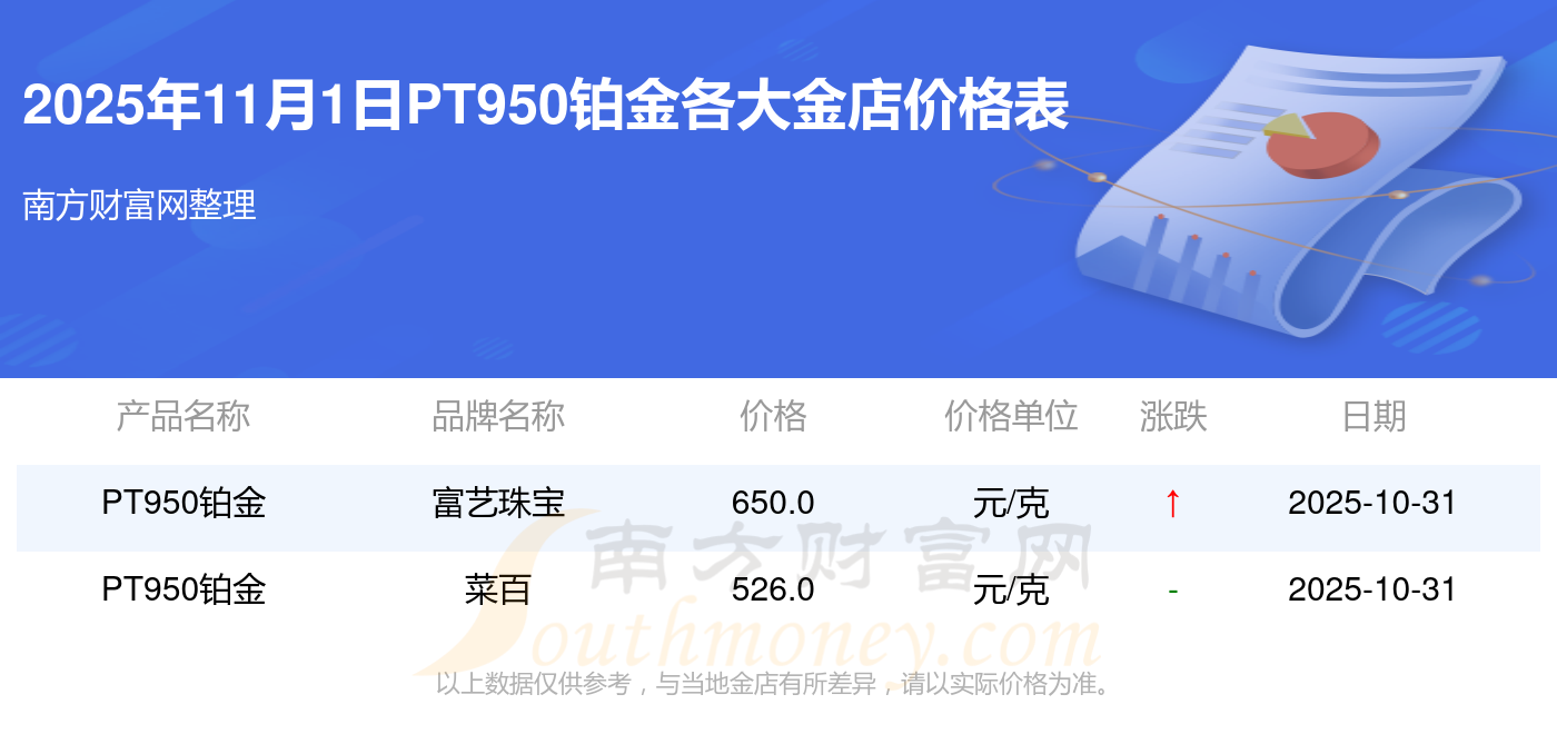 2025年11月1日各大金店PT950铂金最新价格:周大福1198.0元/克,周大福650.0元/克,周大福1198.0元/克,周大福44660.0,周大福18640.0,周大福40080.0,周大福1058.0元/克,老凤祥1200.0元/克,老凤祥560.0元/克,老凤祥1200.0元/克,周六福1135.0元/克。