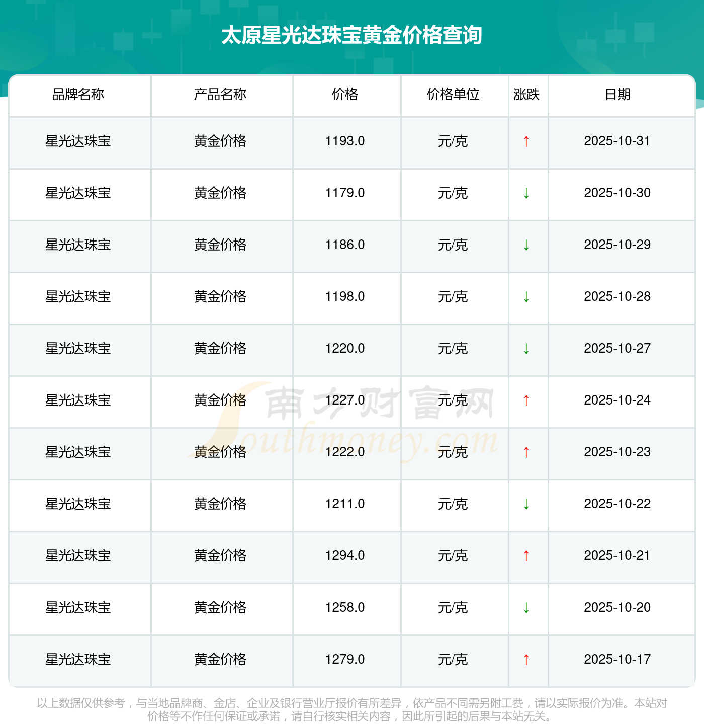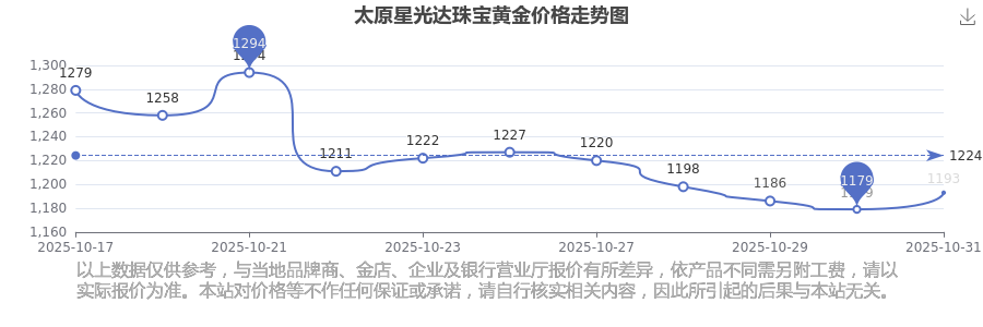 2025年11月1日,太原星光达珠宝黄金价格每克的售卖价位为1193.0元/克。
