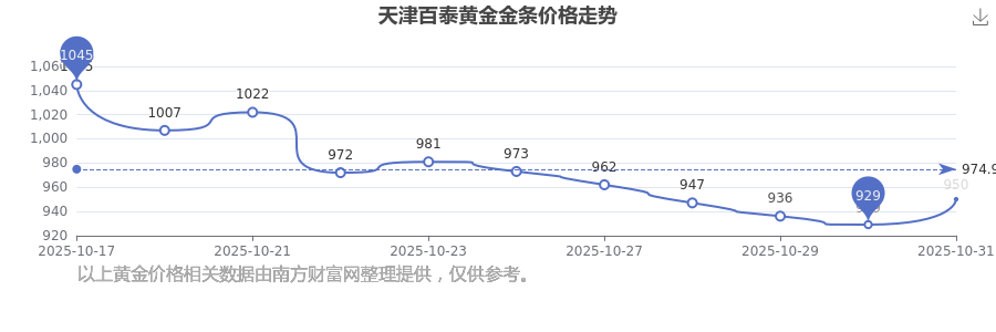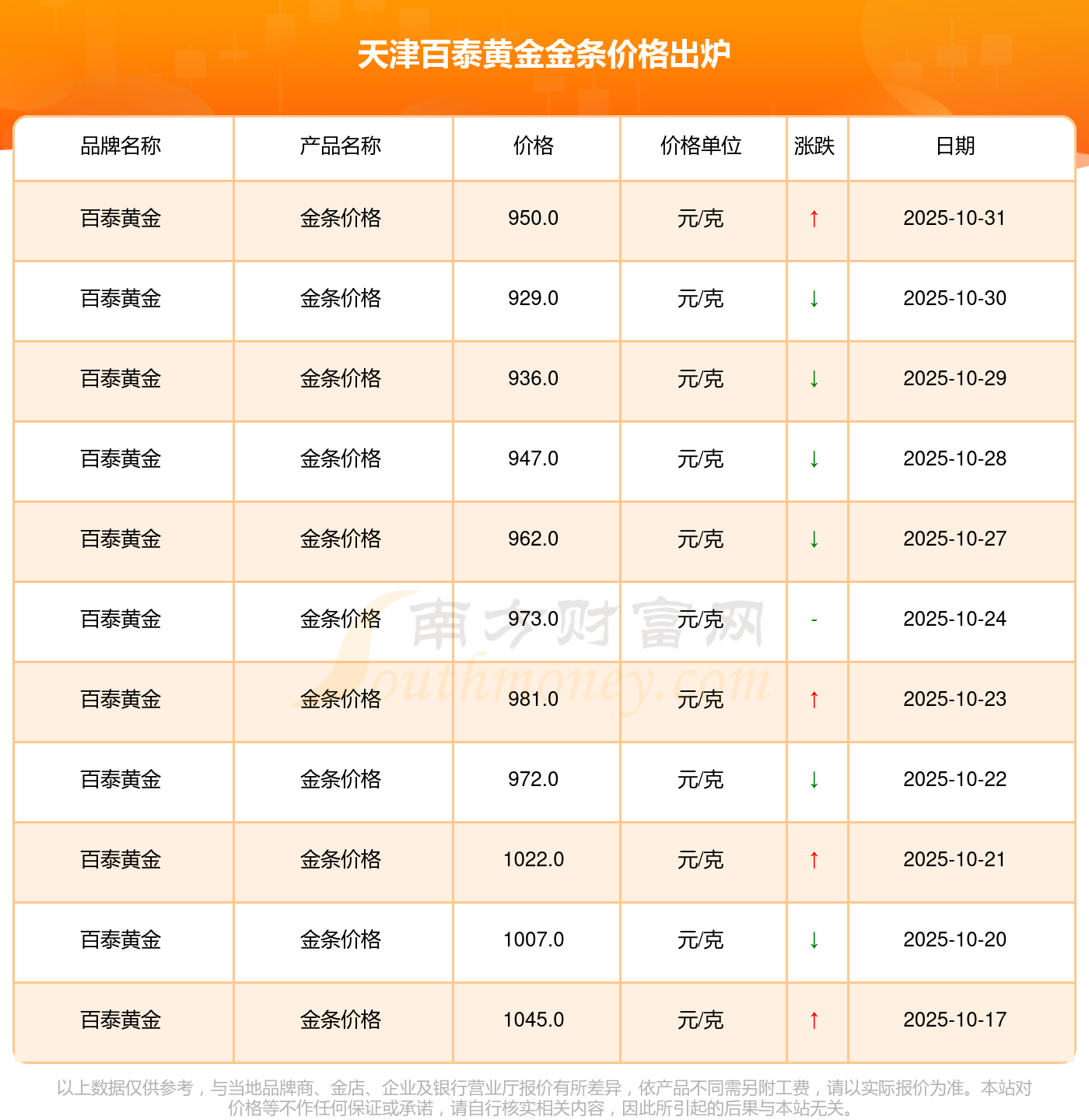 今日天津百泰黄金金条价格最新为:950.0元/克。