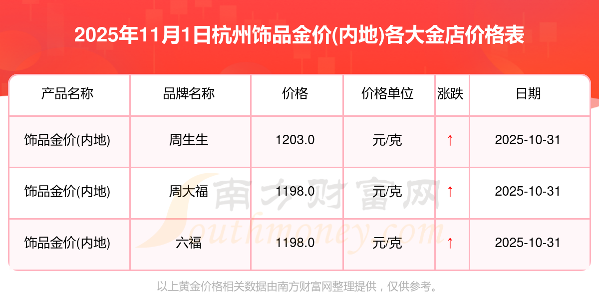 2025年11月1日杭州周大福、周大福、周大福、周大福、周大福、周大福、周大福、老凤祥、老凤祥、老凤祥、周六福等各大金店品牌饰品金价(内地)最新价格行情来了,如下:周大福黄金价格1198.0元/克,周大福铂金价格650.0元/克,周大福饰品金价(内地)1198.0元/克,周大福黄金饰品(香港)44660.0,周大福铂金价格(香港)18640.0,周大福金条价格(香港)40080.0,周大福金条金价(内地)1058.0元/克,老凤祥黄金价格1200.0元/克,老凤祥铂金价格560.0元/克,老凤祥足金价格1200.0元/克,周六福黄金价格1135.0元/克。