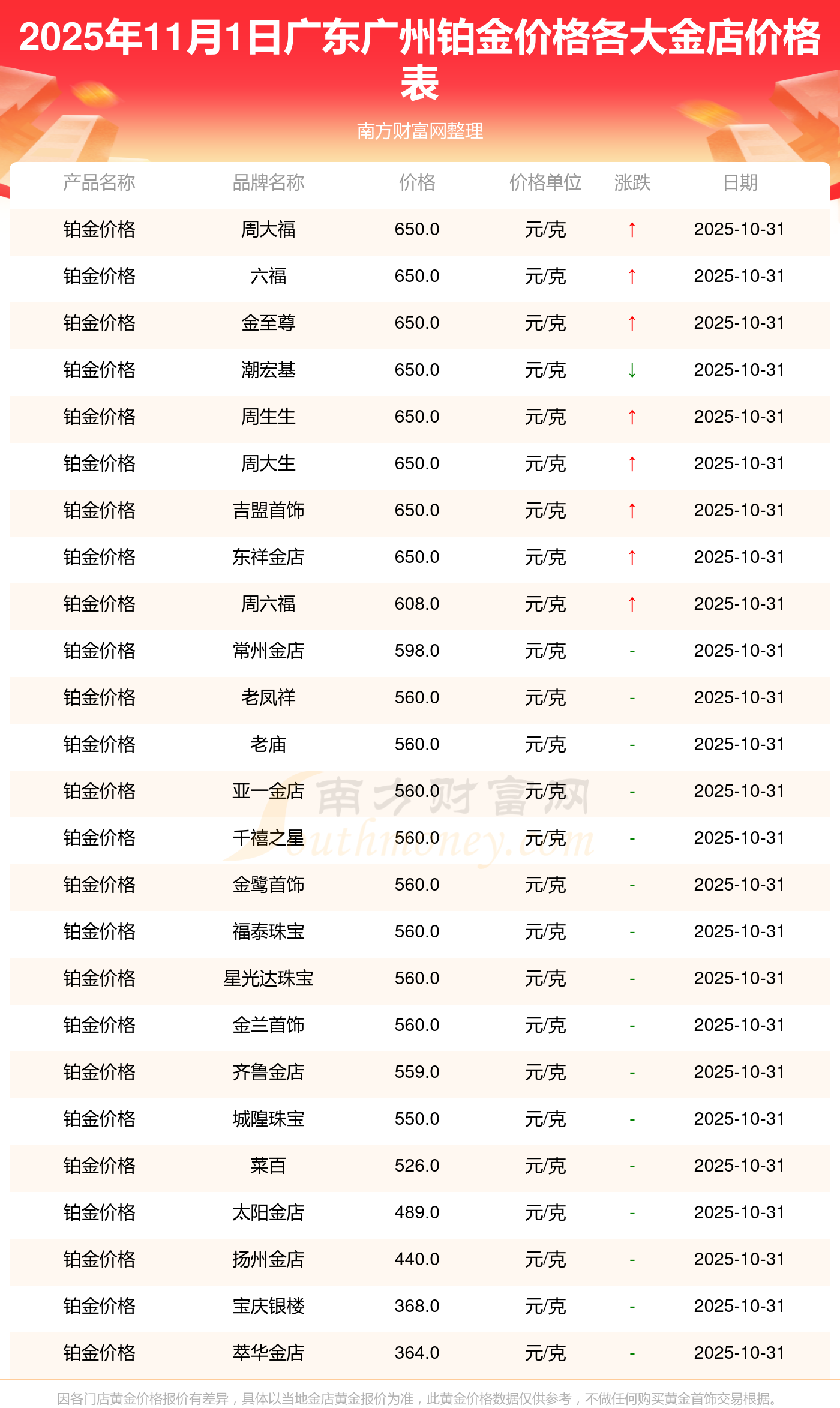今天是2025年11月1日,广东广州周大福、周大福、周大福、周大福、周大福、周大福、周大福、老凤祥、老凤祥、老凤祥、周六福等各大金店品牌铂金价格最新价格如下:周大福1198.0元/克、周大福650.0元/克、周大福1198.0元/克、周大福44660.0、周大福18640.0、周大福40080.0、周大福1058.0元/克、老凤祥1200.0元/克、老凤祥560.0元/克、老凤祥1200.0元/克、周六福1135.0元/克。