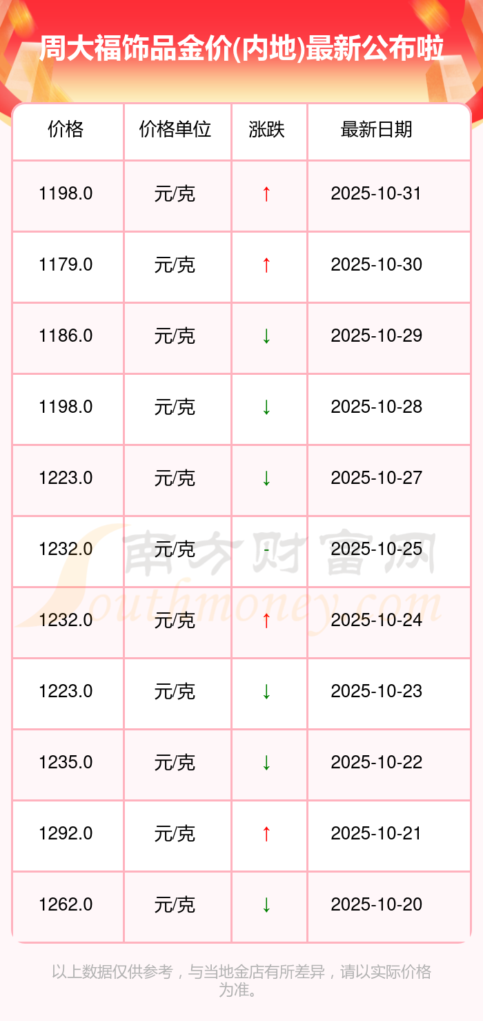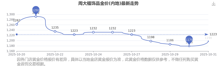 今日(2025年11月1日)周大福饰品金价(内地)是1198.0元/克。