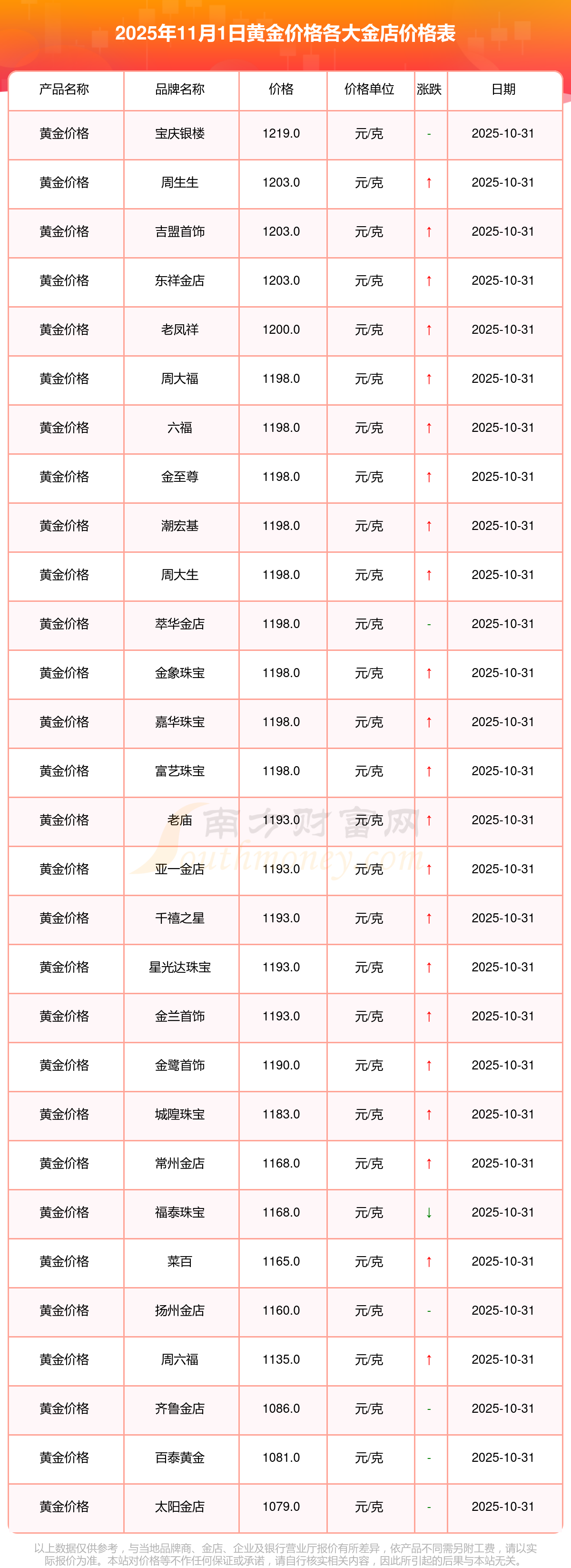 今天是2025年11月1日,周大福、周大福、周大福、周大福、周大福、周大福、周大福、老凤祥、老凤祥、老凤祥、周六福等各大金店品牌黄金价格最新价格如下:周大福1198.0元/克、周大福650.0元/克、周大福1198.0元/克、周大福44660.0、周大福18640.0、周大福40080.0、周大福1058.0元/克、老凤祥1200.0元/克、老凤祥560.0元/克、老凤祥1200.0元/克、周六福1135.0元/克。