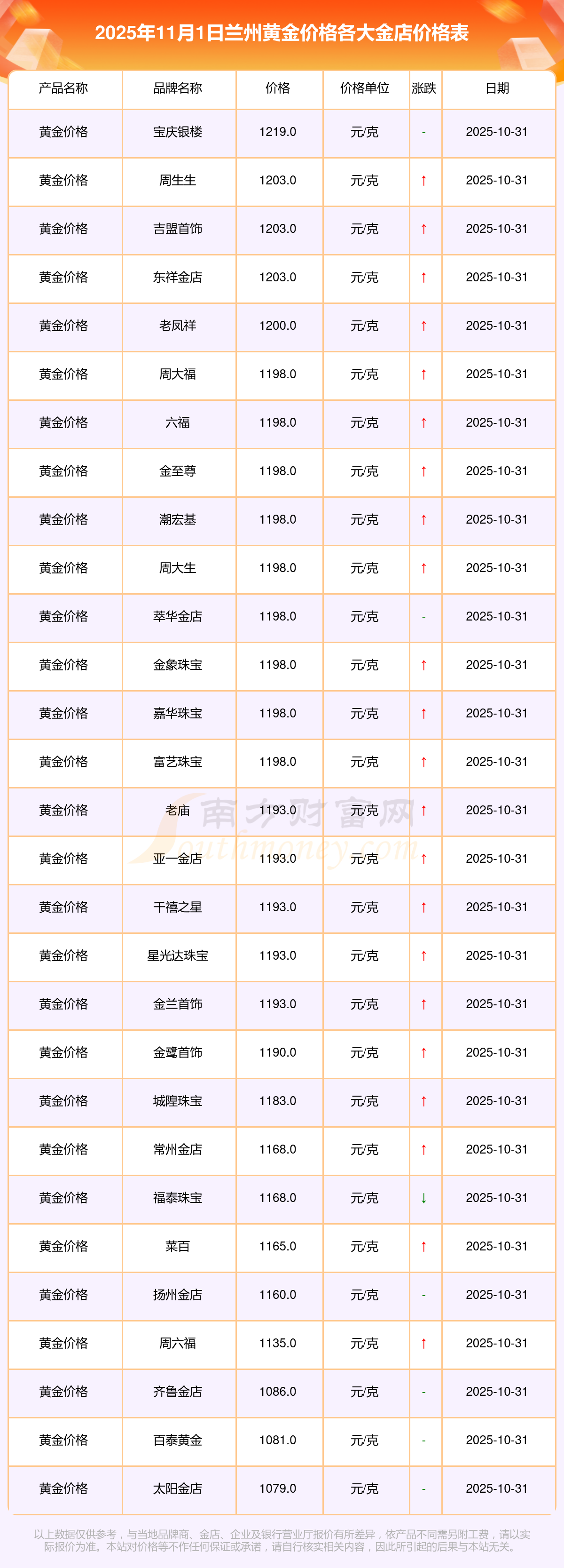 一、2025年11月1日兰州周大福、周大福、周大福、周大福、周大福、周大福、周大福、老凤祥、老凤祥、老凤祥、周六福等各大金店品牌黄金价格最新价格行情来了,如下:周大福黄金价格1198.0元/克,周大福铂金价格650.0元/克,周大福饰品金价(内地)1198.0元/克,周大福黄金饰品(香港)44660.0,周大福铂金价格(香港)18640.0,周大福金条价格(香港)40080.0,周大福金条金价(内地)1058.0元/克,老凤祥黄金价格1200.0元/克,老凤祥铂金价格560.0元/克,老凤祥足金价格1200.0元/克,周六福黄金价格1135.0元/克。