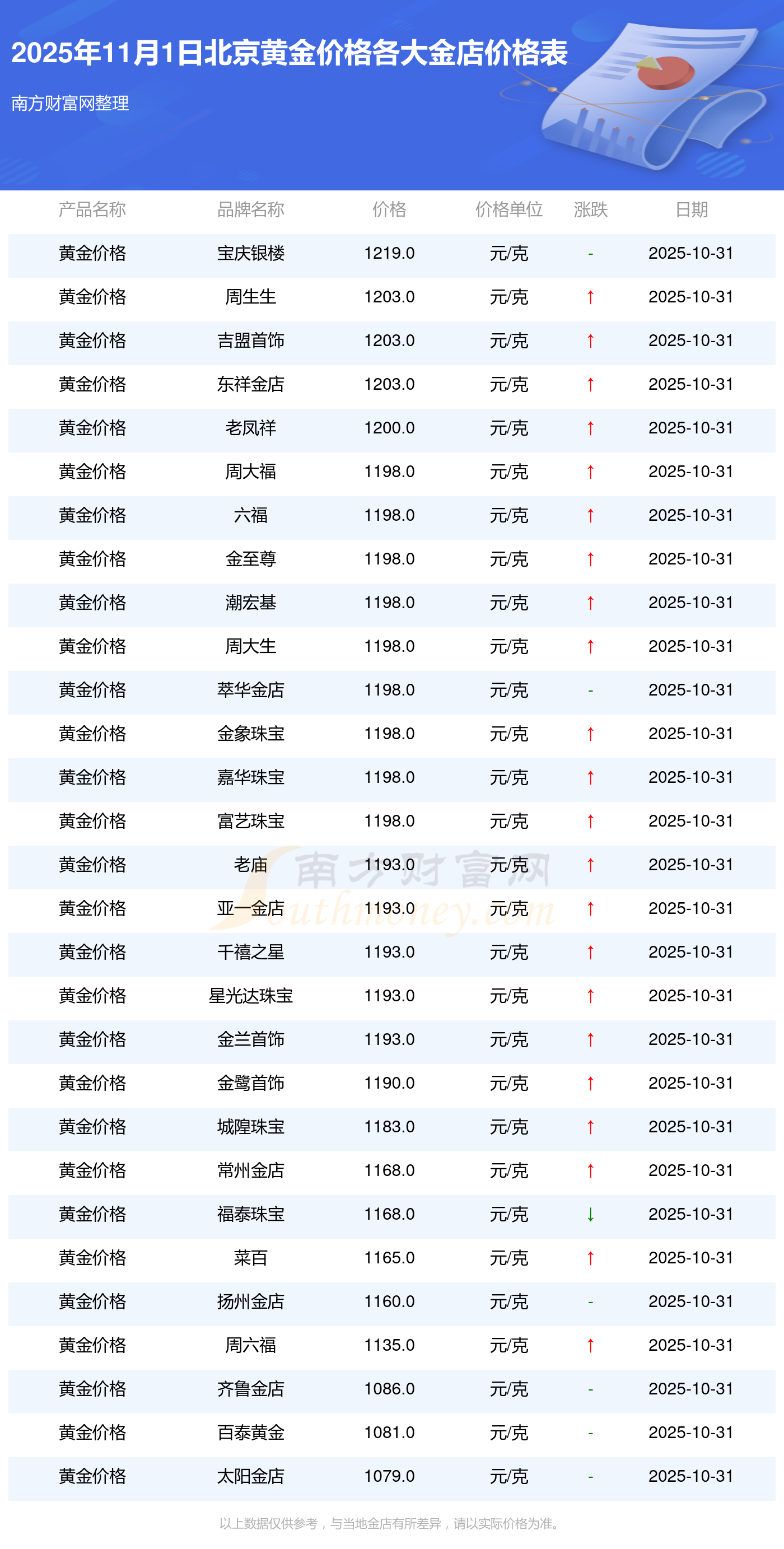 2025年11月1日北京各大金店黄金价格最新价格查询来了:周大福1198.0元/克,周大福650.0元/克,周大福1198.0元/克,周大福44660.0,周大福18640.0,周大福40080.0,周大福1058.0元/克,老凤祥1200.0元/克,老凤祥560.0元/克,老凤祥1200.0元/克,周六福1135.0元/克。