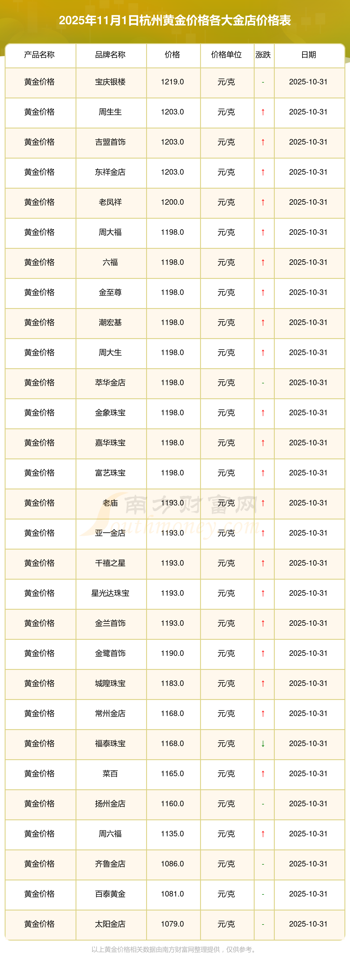 2025年11月1日,杭州周大福、周大福、周大福、周大福、周大福、周大福、周大福、老凤祥、老凤祥、老凤祥、周六福等各大金店品牌黄金价格今日价格行情最新来了:周大福1198.0元/克、周大福650.0元/克、周大福1198.0元/克、周大福44660.0、周大福18640.0、周大福40080.0、周大福1058.0元/克、老凤祥1200.0元/克、老凤祥560.0元/克、老凤祥1200.0元/克、周六福1135.0元/克。