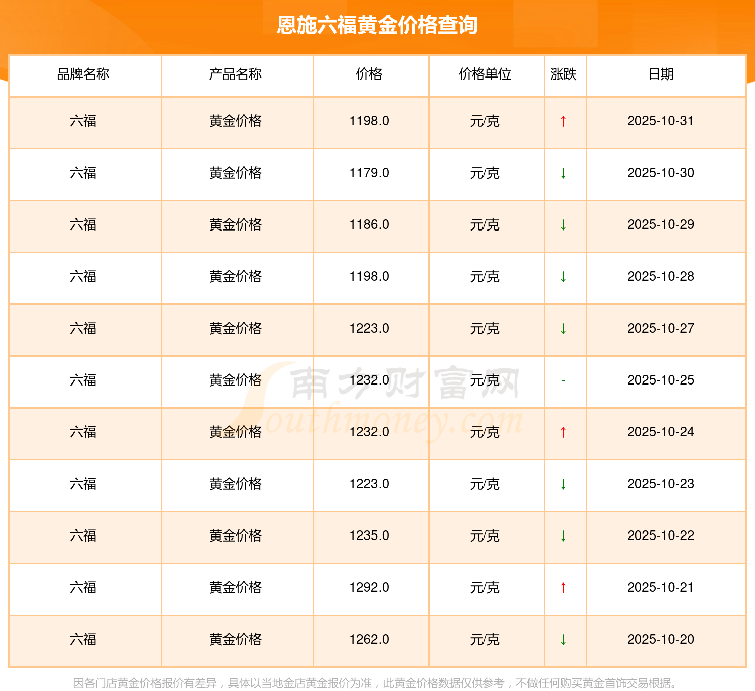 2025年11月1日,今日恩施六福黄金价格:1198.0元/克。