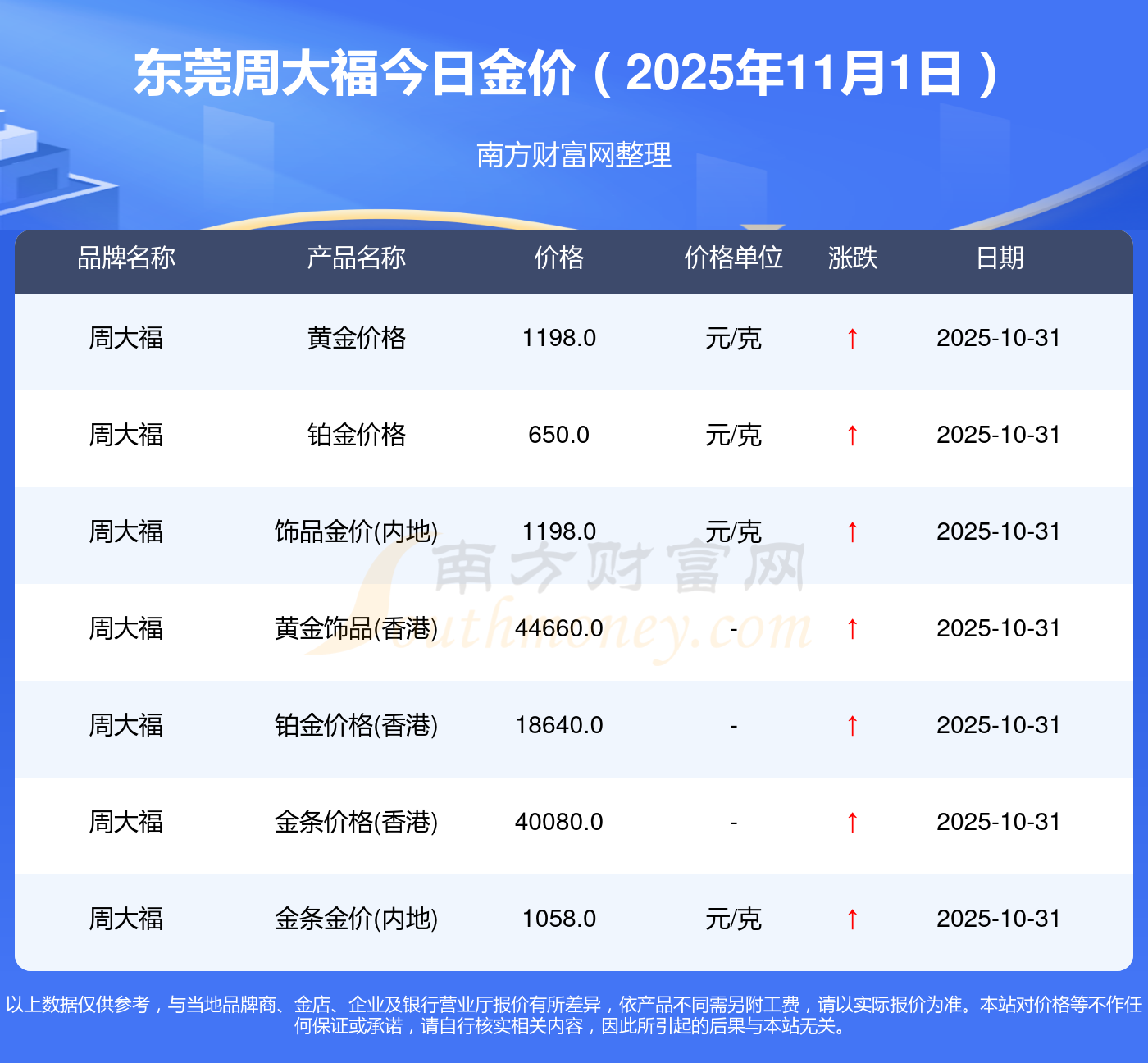 2025年11月1日东莞周大福最新价格:黄金价格1198.0元/克,铂金价格650.0元/克,饰品金价(内地)1198.0元/克,黄金饰品(香港)44660.0,铂金价格(香港)18640.0,金条价格(香港)40080.0,金条金价(内地)1058.0元/克,黄金价格1200.0元/克,铂金价格560.0元/克,足金价格1200.0元/克,黄金价格1135.0元/克。