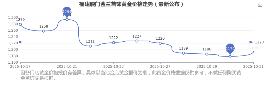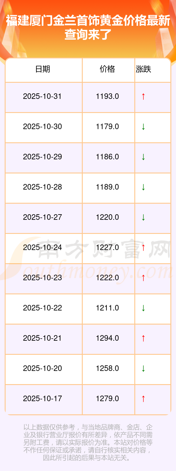 福建厦门金兰首饰在 2025年11月1日的黄金价格零售价格为 1193.0元/克。