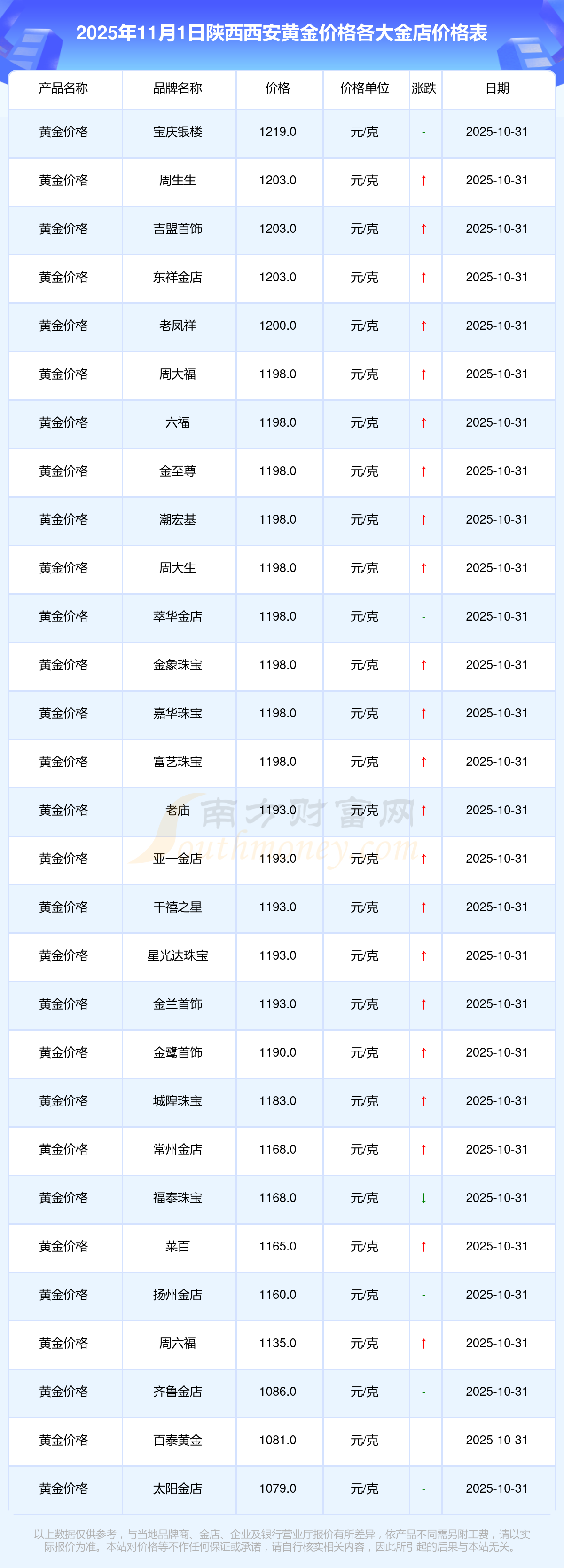 今天是2025年11月1日,陕西西安周大福、周大福、周大福、周大福、周大福、周大福、周大福、老凤祥、老凤祥、老凤祥、周六福等各大金店品牌黄金价格最新价格行情是这样的:周大福1198.0元/克、周大福650.0元/克、周大福1198.0元/克、周大福44660.0、周大福18640.0、周大福40080.0、周大福1058.0元/克、老凤祥1200.0元/克、老凤祥560.0元/克、老凤祥1200.0元/克、周六福1135.0元/克。