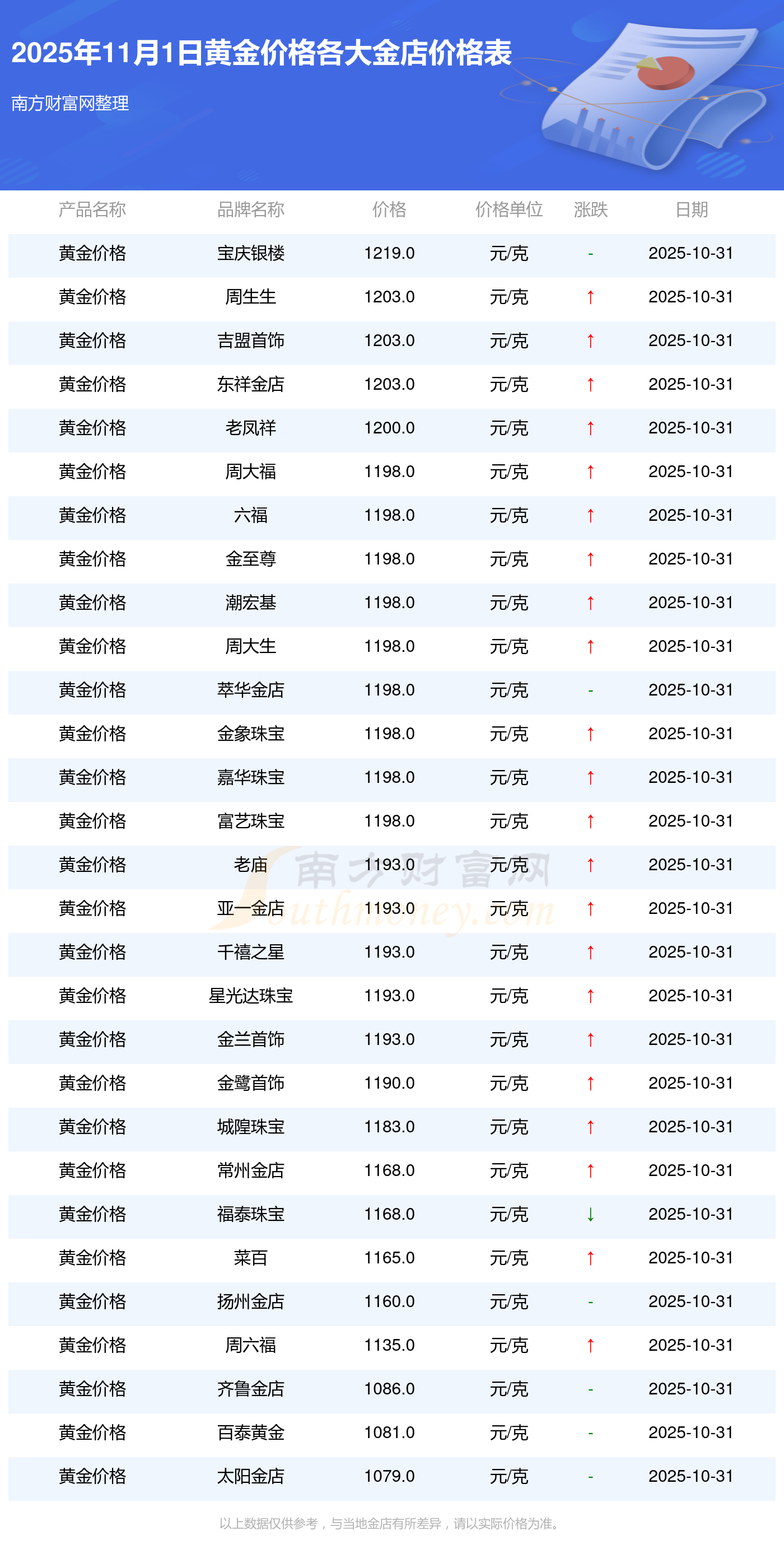 2025年11月1日,周大福、周大福、周大福、周大福、周大福、周大福、周大福、老凤祥、老凤祥、老凤祥、周六福等各大金店品牌黄金价格今日价格如下:周大福1198.0元/克、周大福650.0元/克、周大福1198.0元/克、周大福44660.0、周大福18640.0、周大福40080.0、周大福1058.0元/克、老凤祥1200.0元/克、老凤祥560.0元/克、老凤祥1200.0元/克、周六福1135.0元/克。