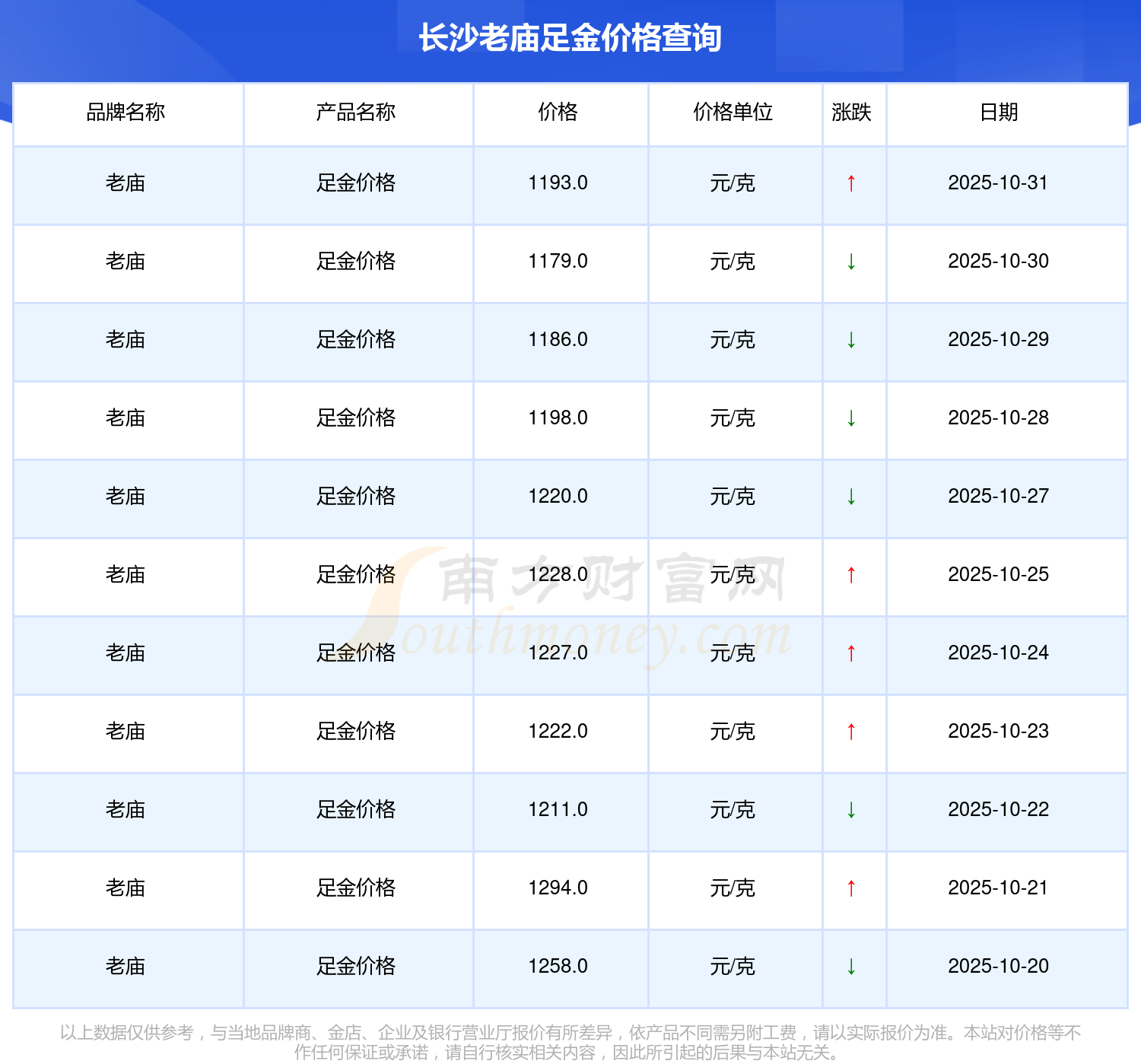于 2025年11月1日,长沙老庙足金价格的克价为1193.0元/克。