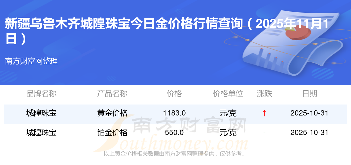 2025年11月1日新疆乌鲁木齐城隍珠宝黄金按克计价,现在多少钱一克?黄金价格1198.0元/克,铂金价格650.0元/克,饰品金价(内地)1198.0元/克,黄金饰品(香港)44660.0,铂金价格(香港)18640.0,金条价格(香港)40080.0,金条金价(内地)1058.0元/克,黄金价格1200.0元/克,铂金价格560.0元/克,足金价格1200.0元/克,黄金价格1135.0元/克。