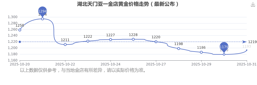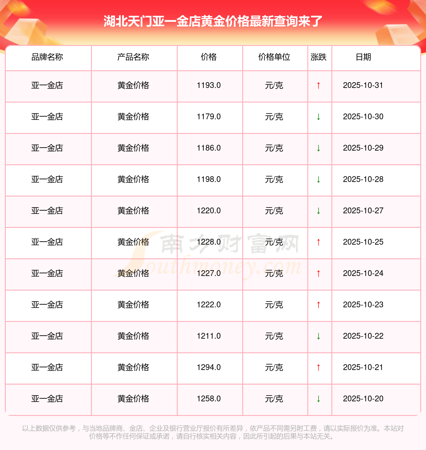 今日(2025年11月1日),1193.0元/克是湖北天门亚一金店黄金价格的价格标准。