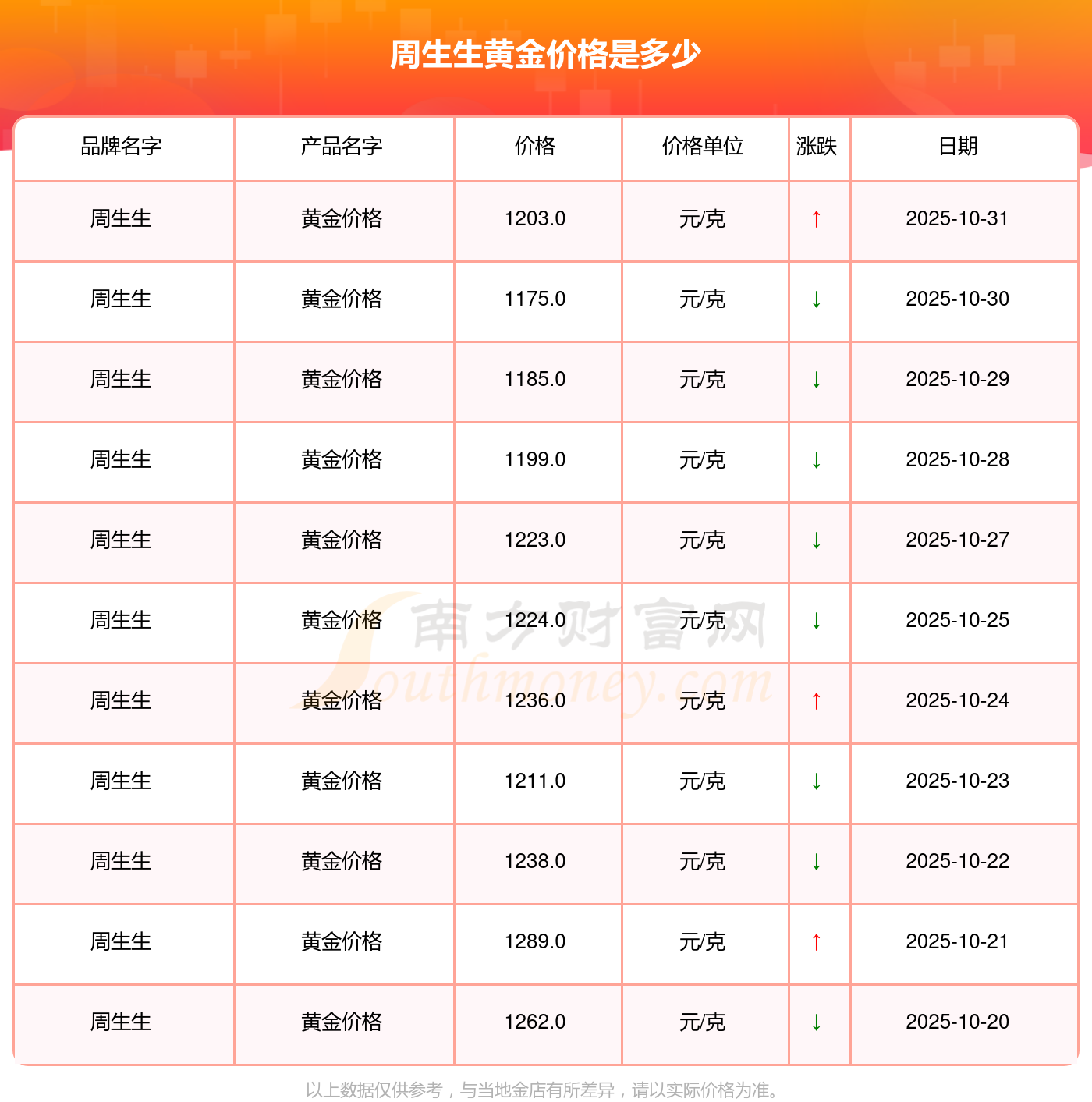 今日黄金价格是怎样的?当下黄金一克要卖多少钱?黄金价格一般是多少钱一克?2025年11月1日周生生黄金价格最新是1203.0元/克。