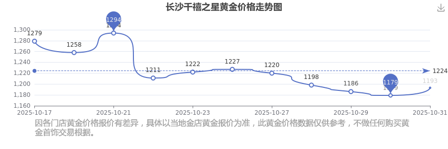 1193.0元/克,这是长沙千禧之星于 2025年11月1日所定的黄金价格。