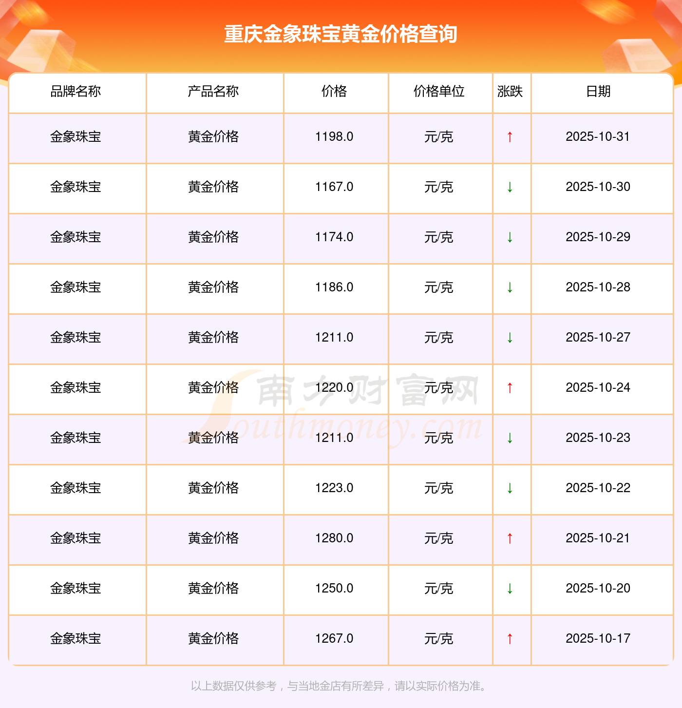 2025年11月1日这一天,重庆金象珠宝的黄金价格以 1198.0元/克的价格售卖。