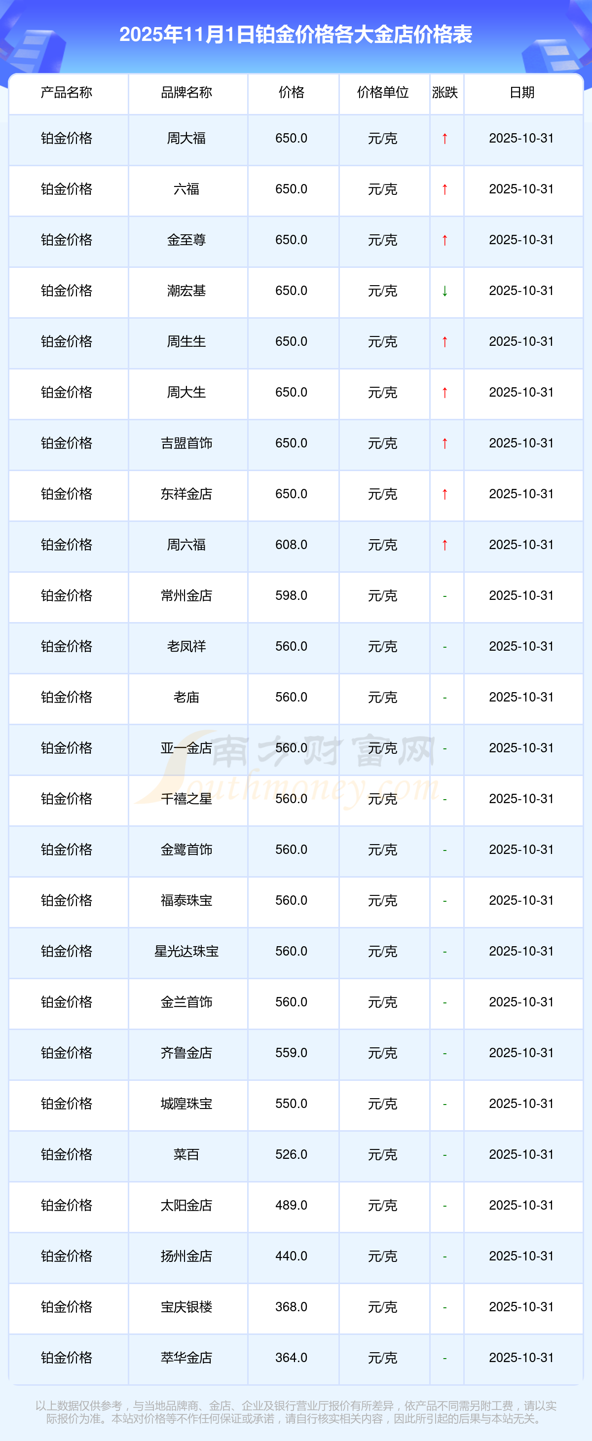 2025年11月1日周大福、周大福、周大福、周大福、周大福、周大福、周大福、老凤祥、老凤祥、老凤祥、周六福等各大金店品牌铂金价格最新价格如下:周大福黄金价格1198.0元/克,周大福铂金价格650.0元/克,周大福饰品金价(内地)1198.0元/克,周大福黄金饰品(香港)44660.0,周大福铂金价格(香港)18640.0,周大福金条价格(香港)40080.0,周大福金条金价(内地)1058.0元/克,老凤祥黄金价格1200.0元/克,老凤祥铂金价格560.0元/克,老凤祥足金价格1200.0元/克,周六福黄金价格1135.0元/克。