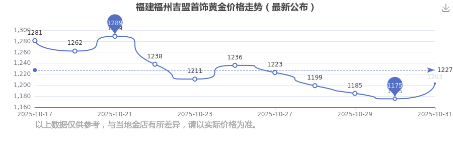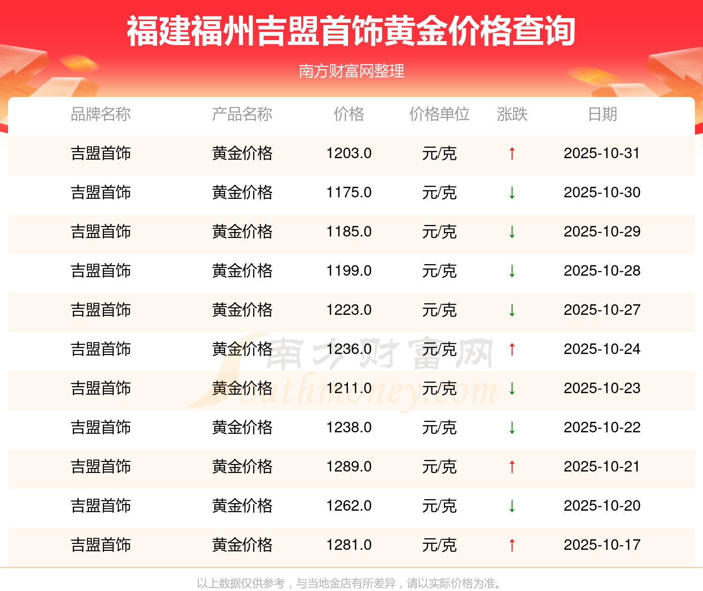 2025年11月1日这一天,福建福州吉盟首饰的黄金价格以 1203.0元/克的价格售卖。