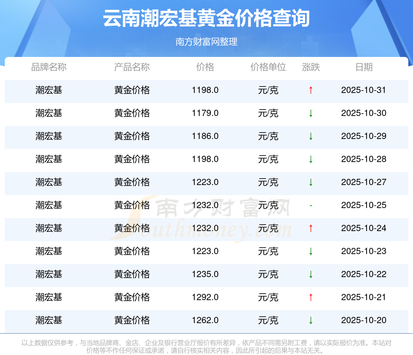 1198.0元/克的黄金价格,是云南潮宏基在 2025年11月1日给出的。